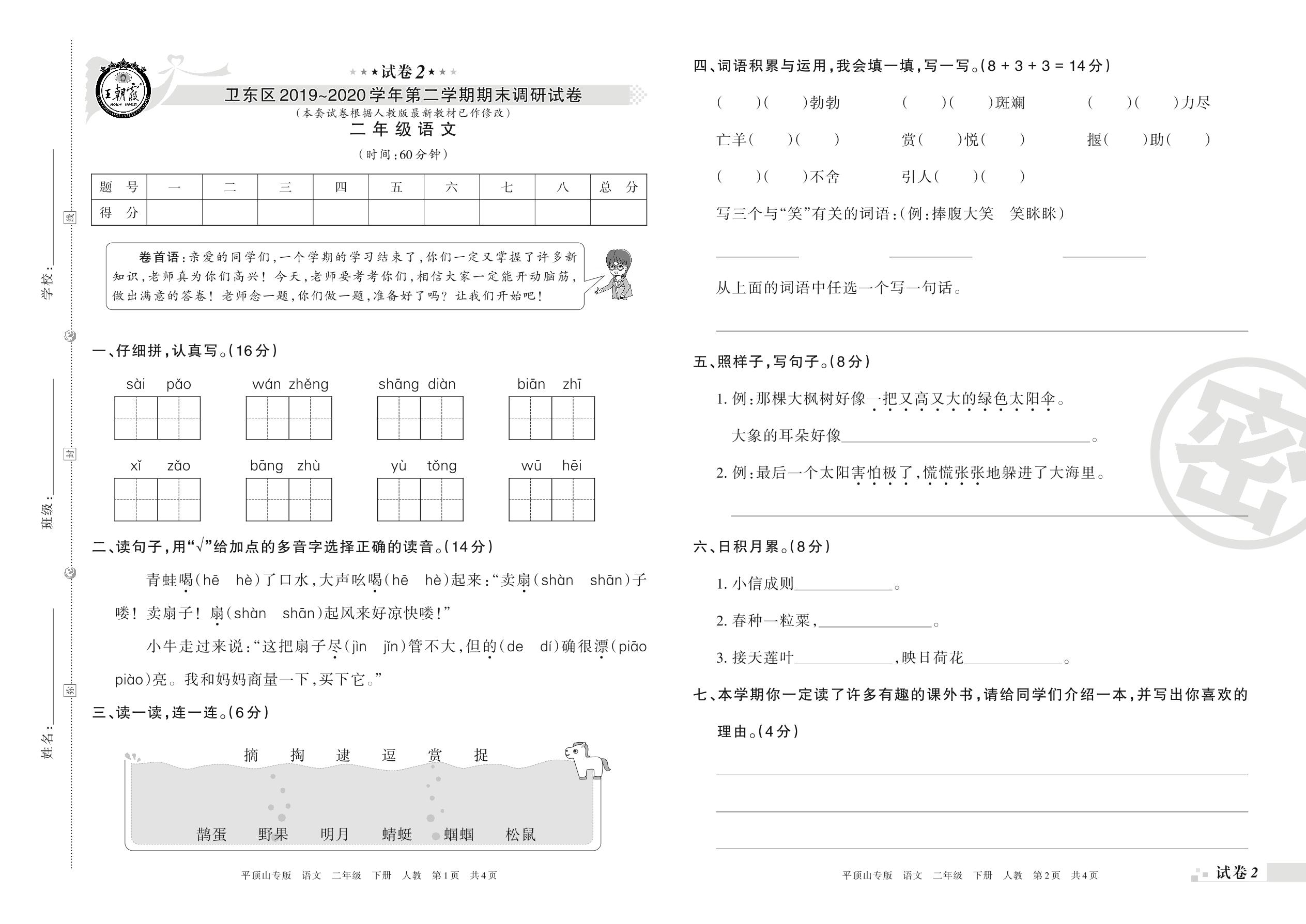 2019-2020学年第二学期平顶山市卫东区二年级语文试卷(人教版)【2】