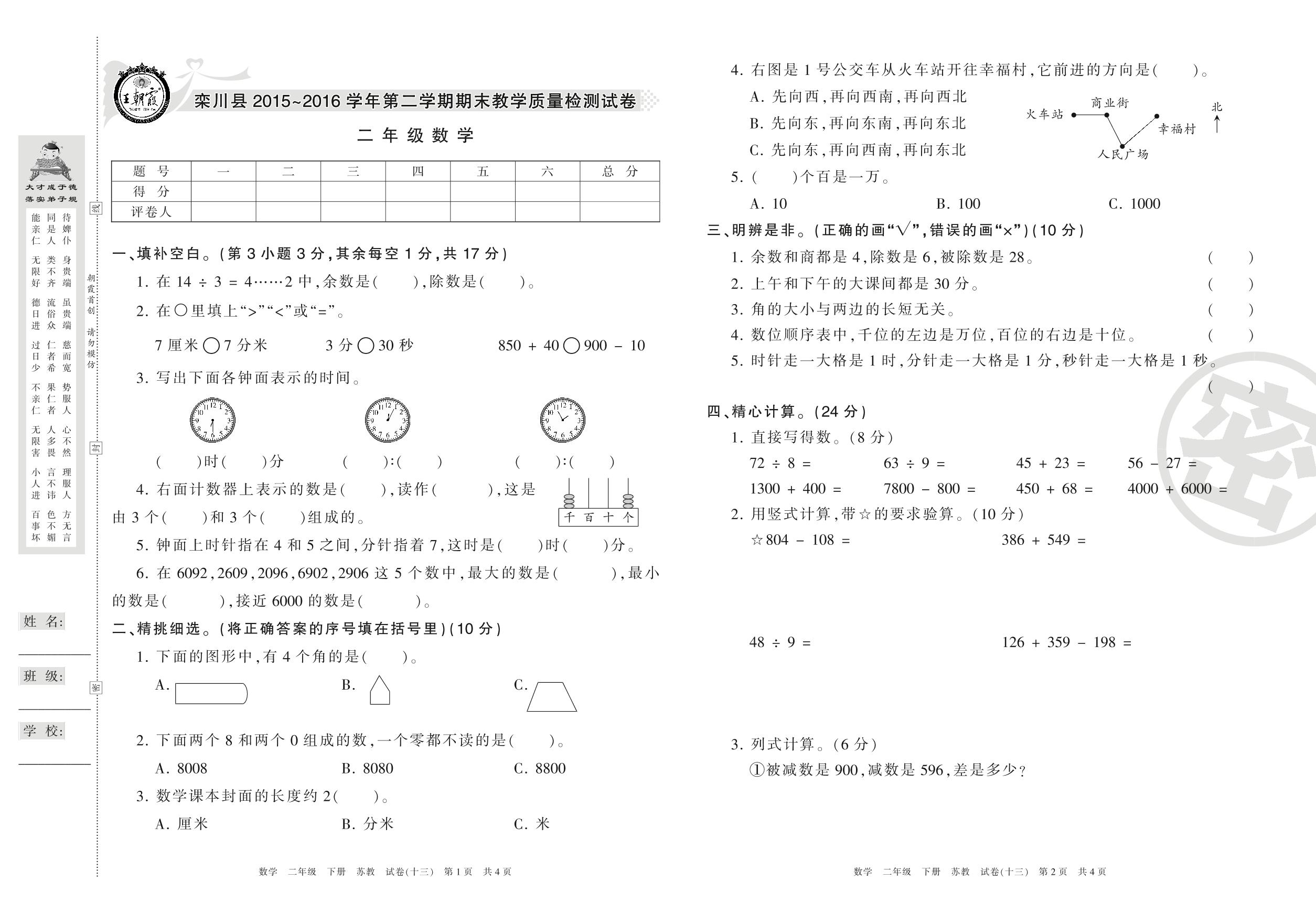 2015-2016学年第二学期洛阳市栾川县二年级数学试卷(苏教版)【13】