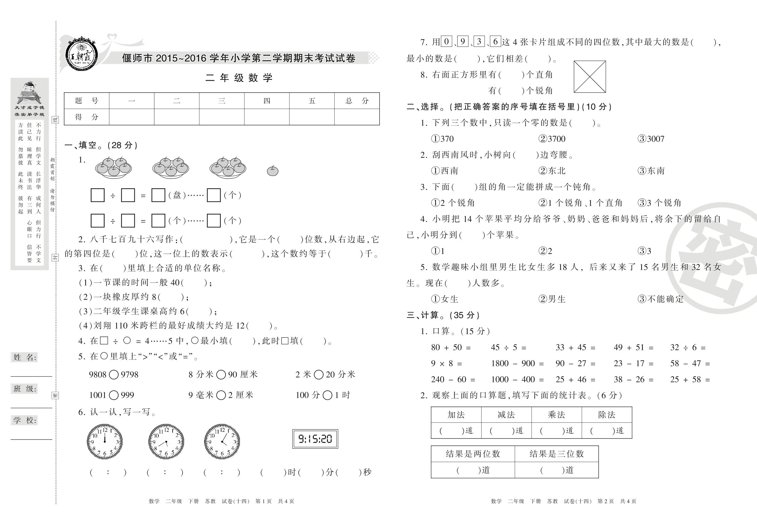 2015-2016学年第二学期偃师市二年级数学试卷(苏教版)【14】