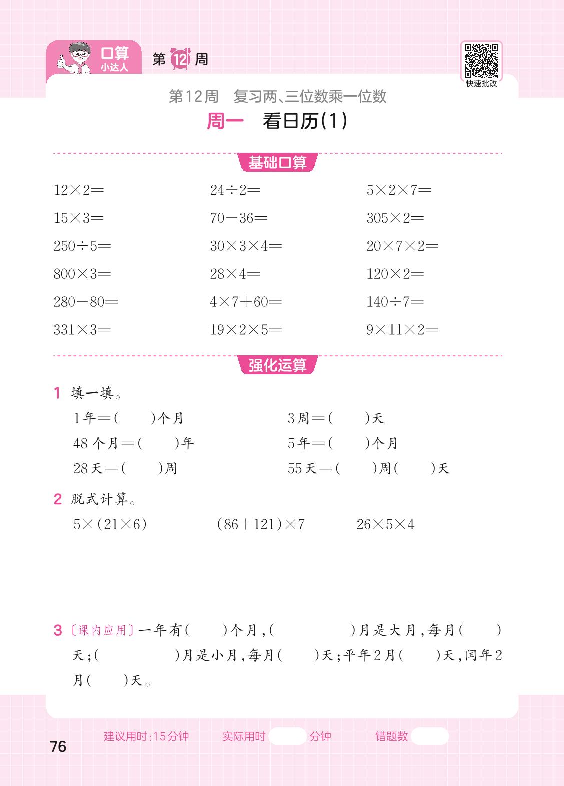2023上册三年级数学北师版 第12周口算运算