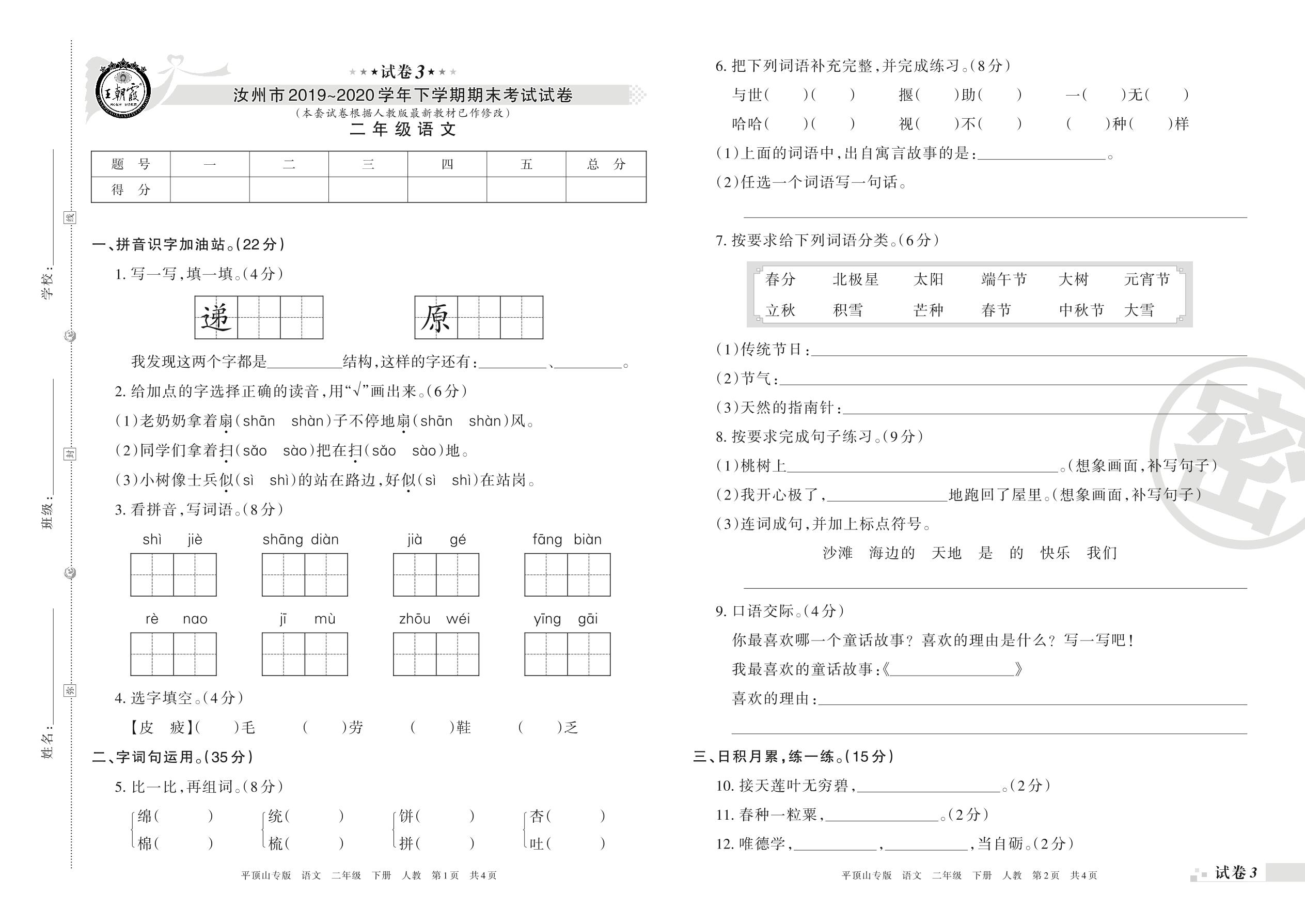 2019-2020学年第二学期汝州市二年级语文试卷(人教版)【3】