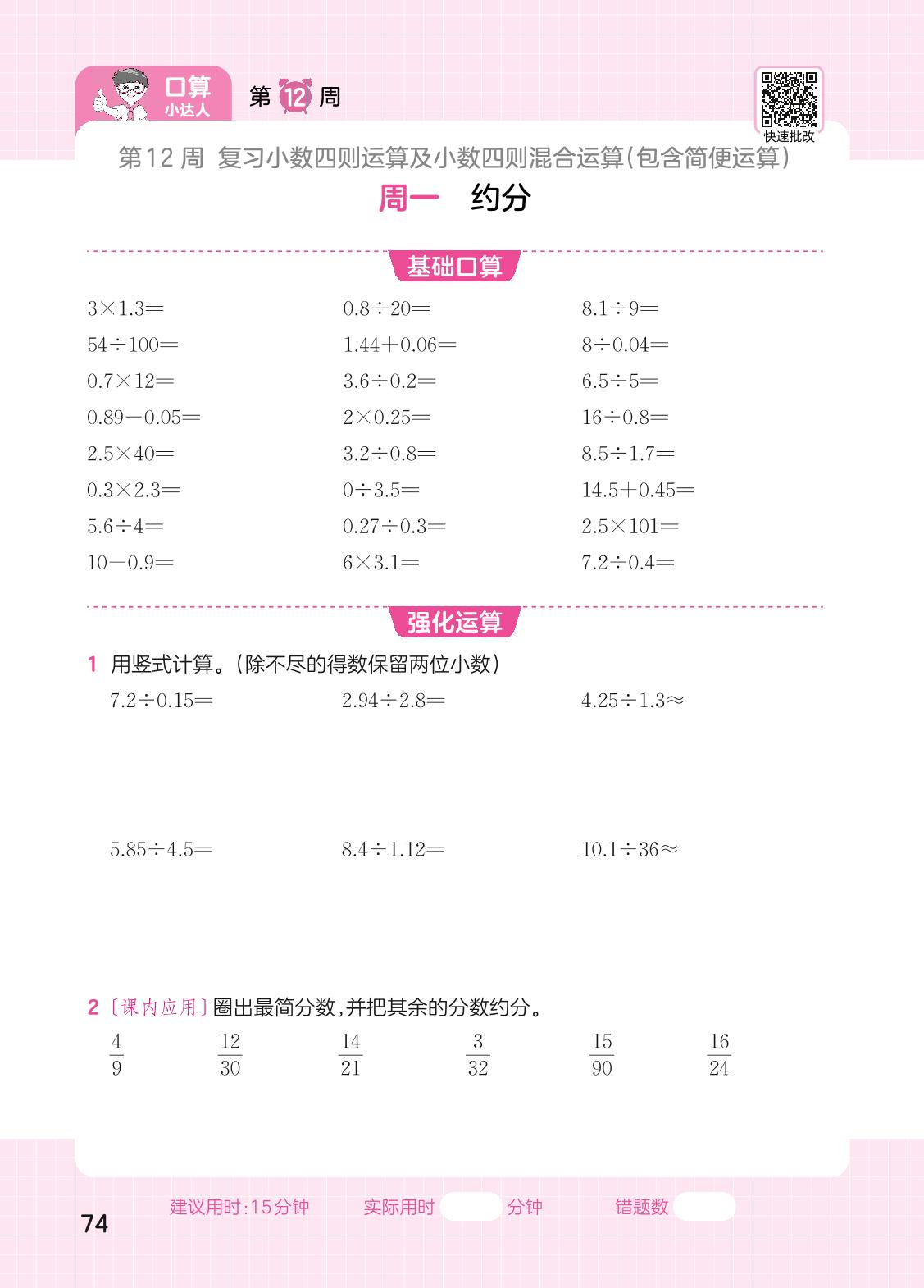 2023上册五年级数学北师版 第12周口算运算