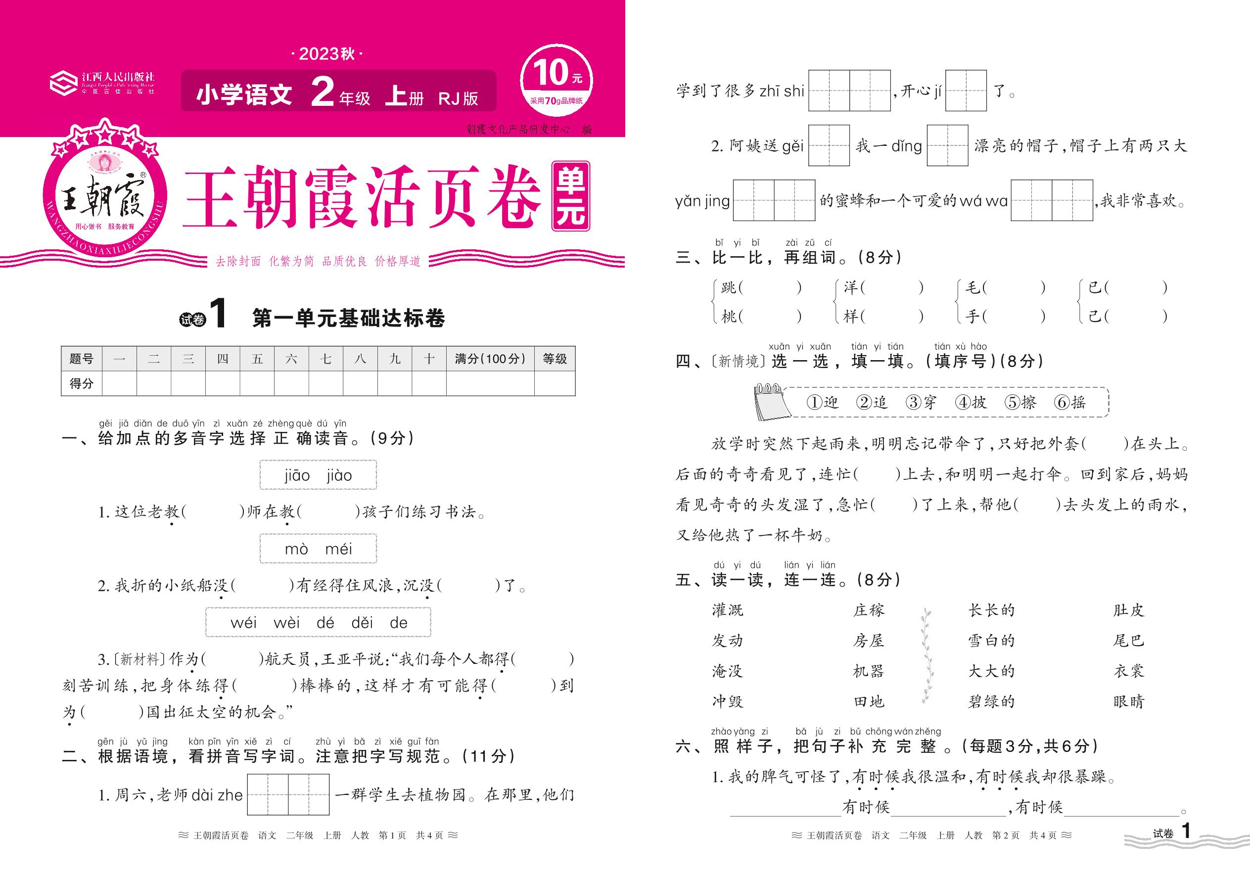 2023上册二年级语文人教版 试卷1 第一单元基础达标卷