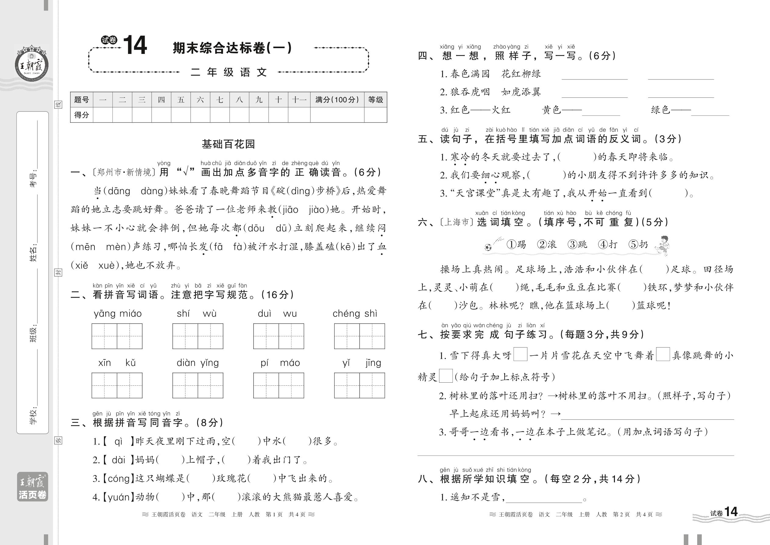 2023上册二年级语文人教版 试卷14 期末综合达标卷(一)