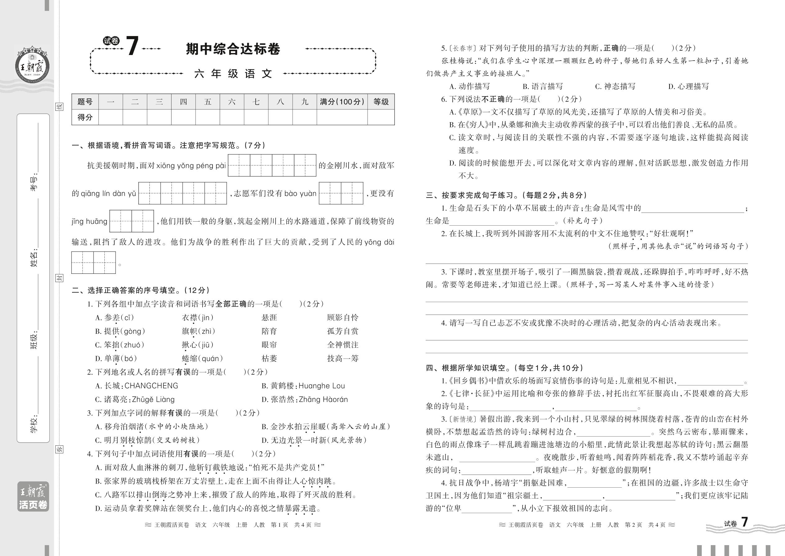 2023上册六年级语文人教版 试卷7 期中综合达标卷
