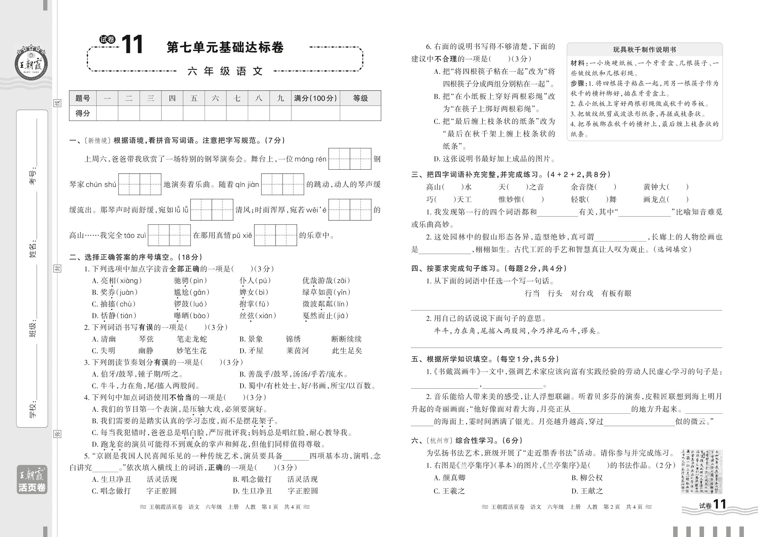 2023上册六年级语文人教版 试卷11 第七单元基础达标卷