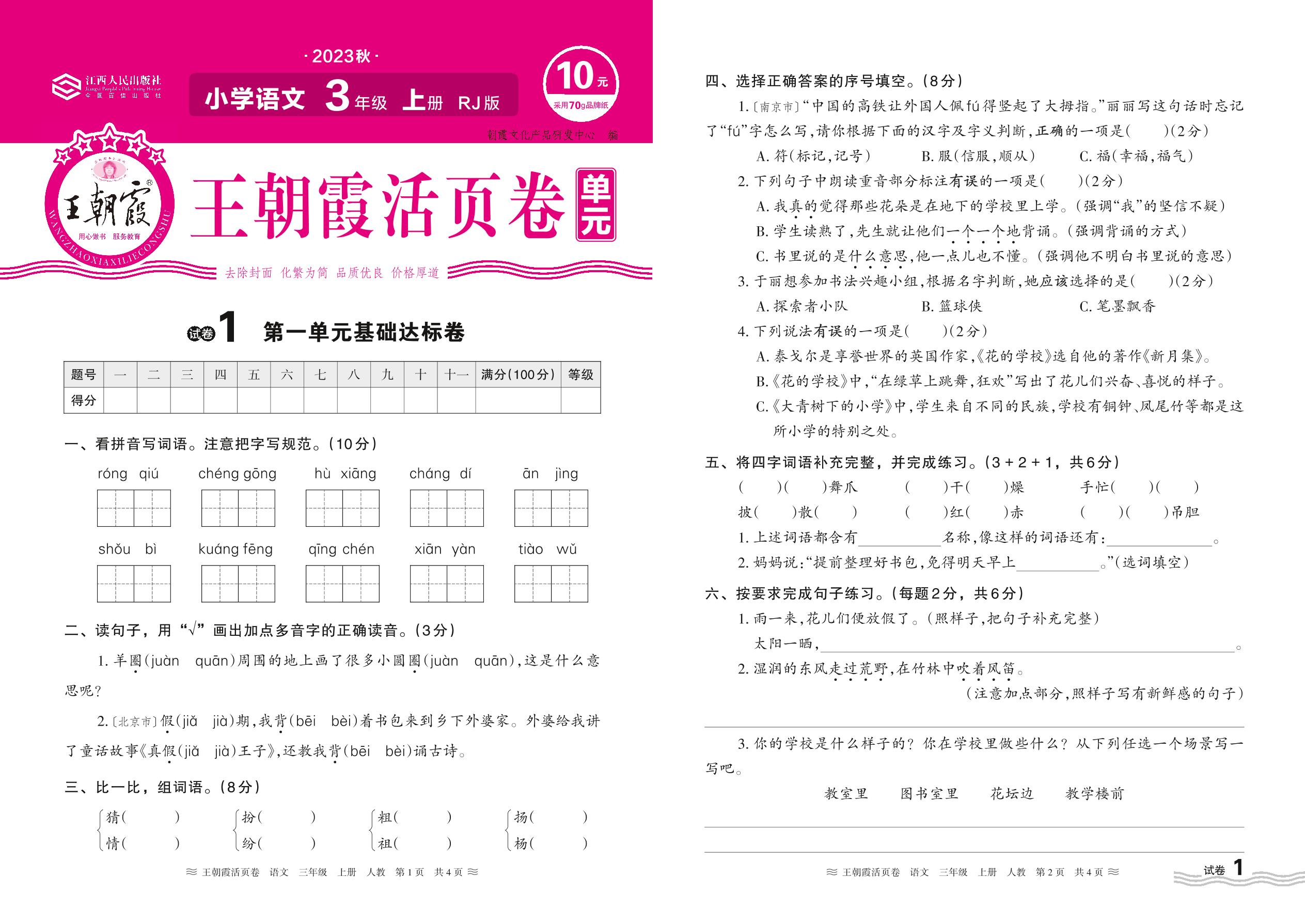 2023上册三年级语文人教版 试卷1 第一单元基础达标卷