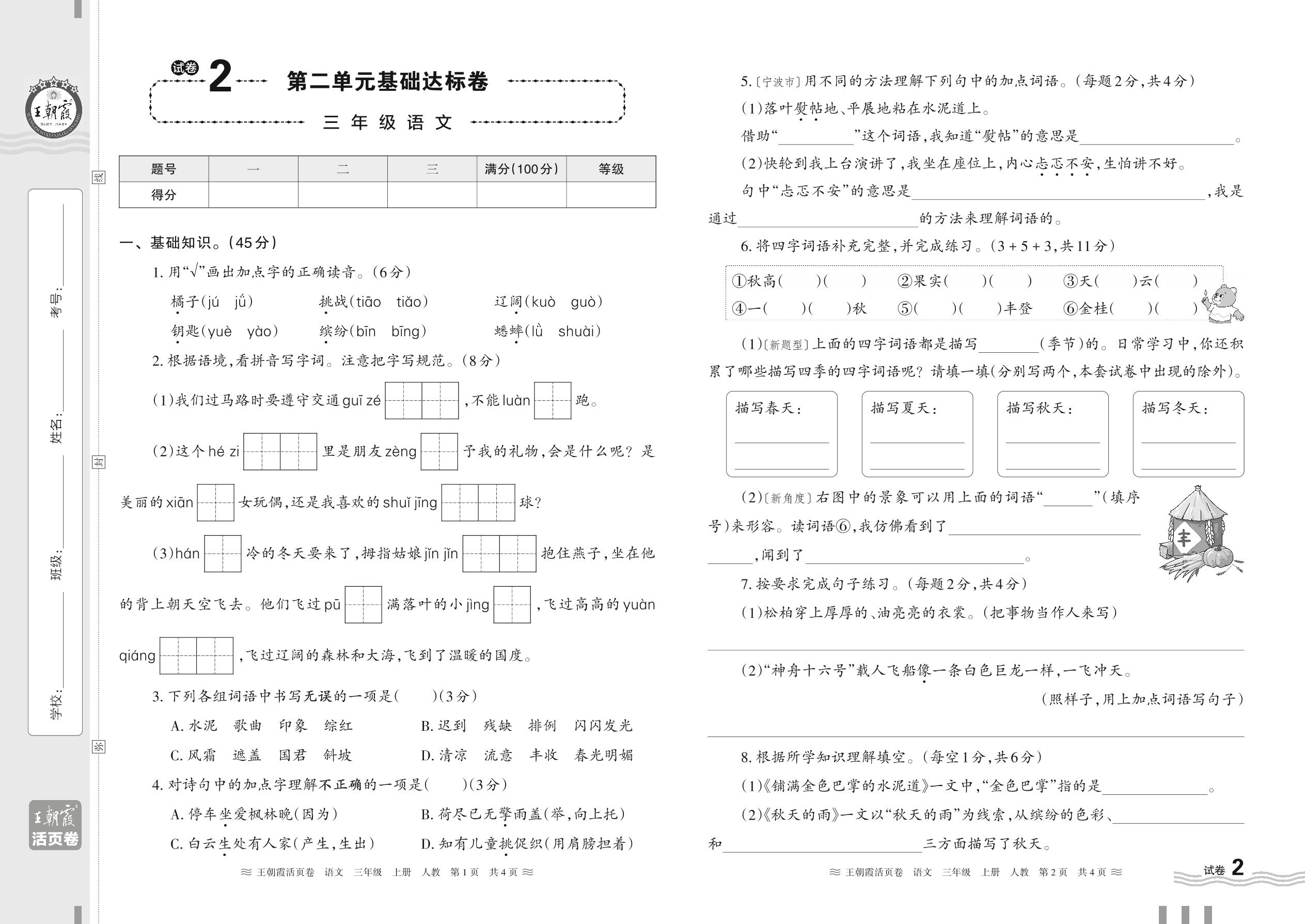 2023上册三年级语文人教版 试卷2 第二单元基础达标卷