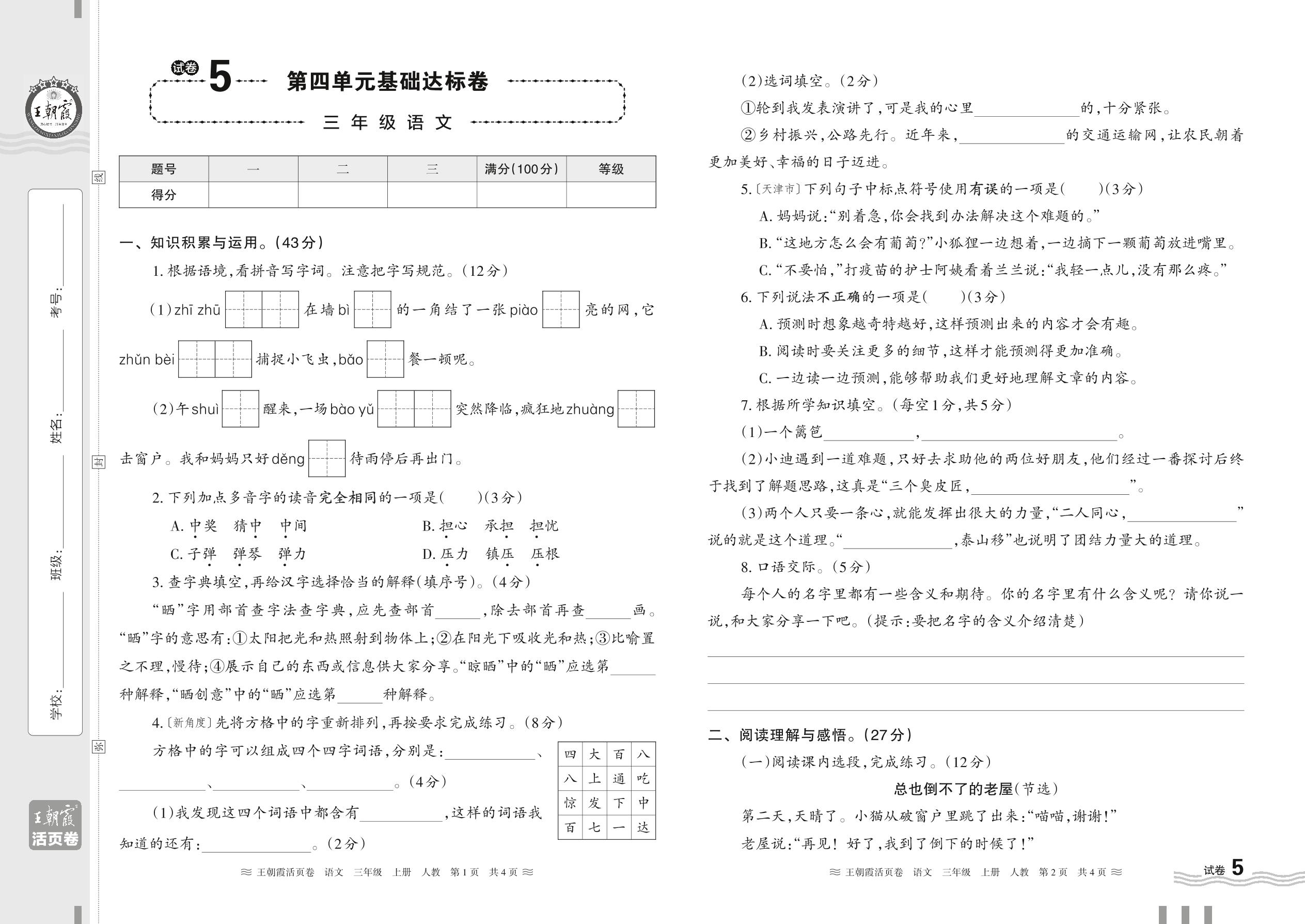 2023上册三年级语文人教版 试卷5 第四单元基础达标卷