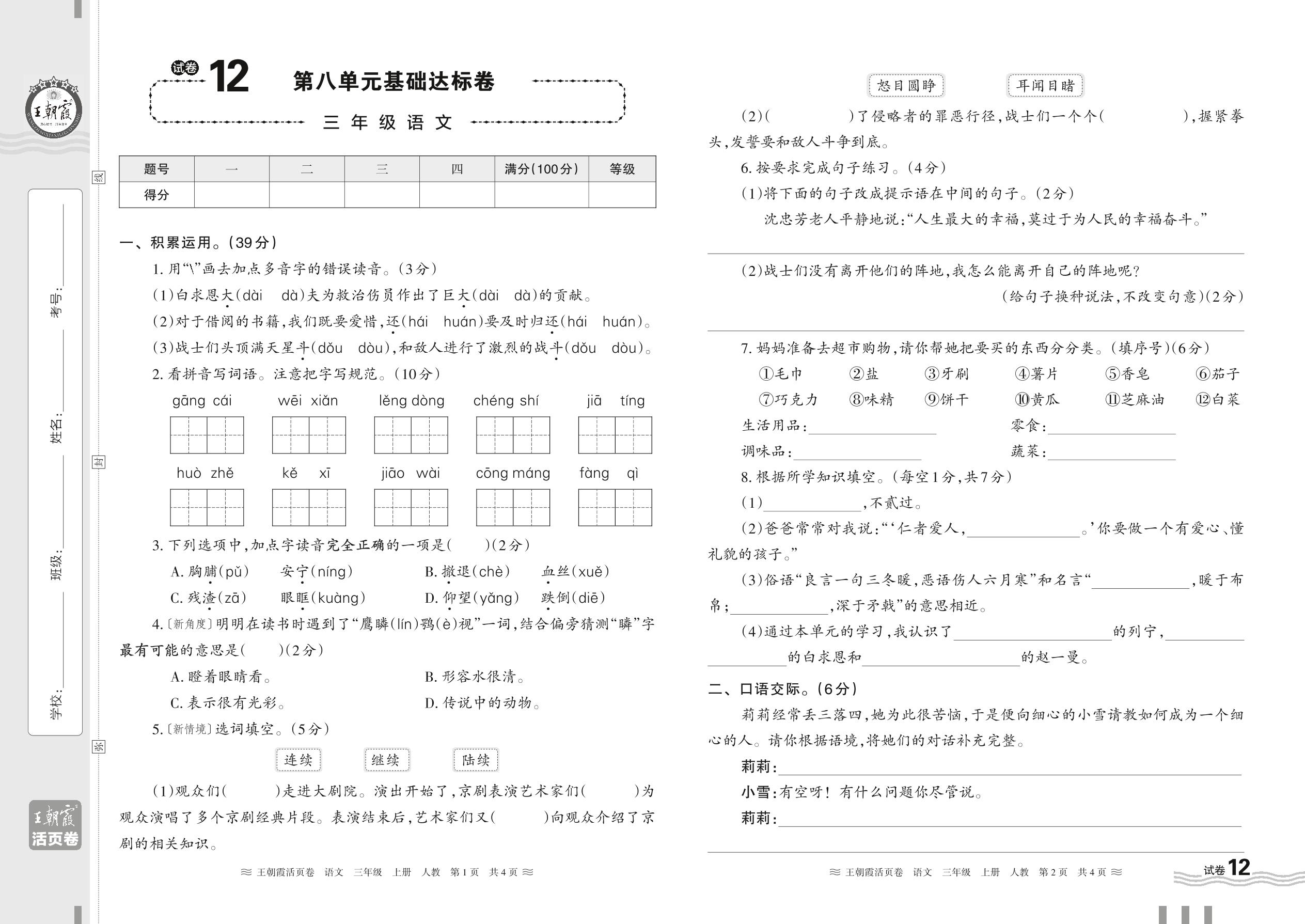 2023上册三年级语文人教版 试卷12 第八单元基础达标卷