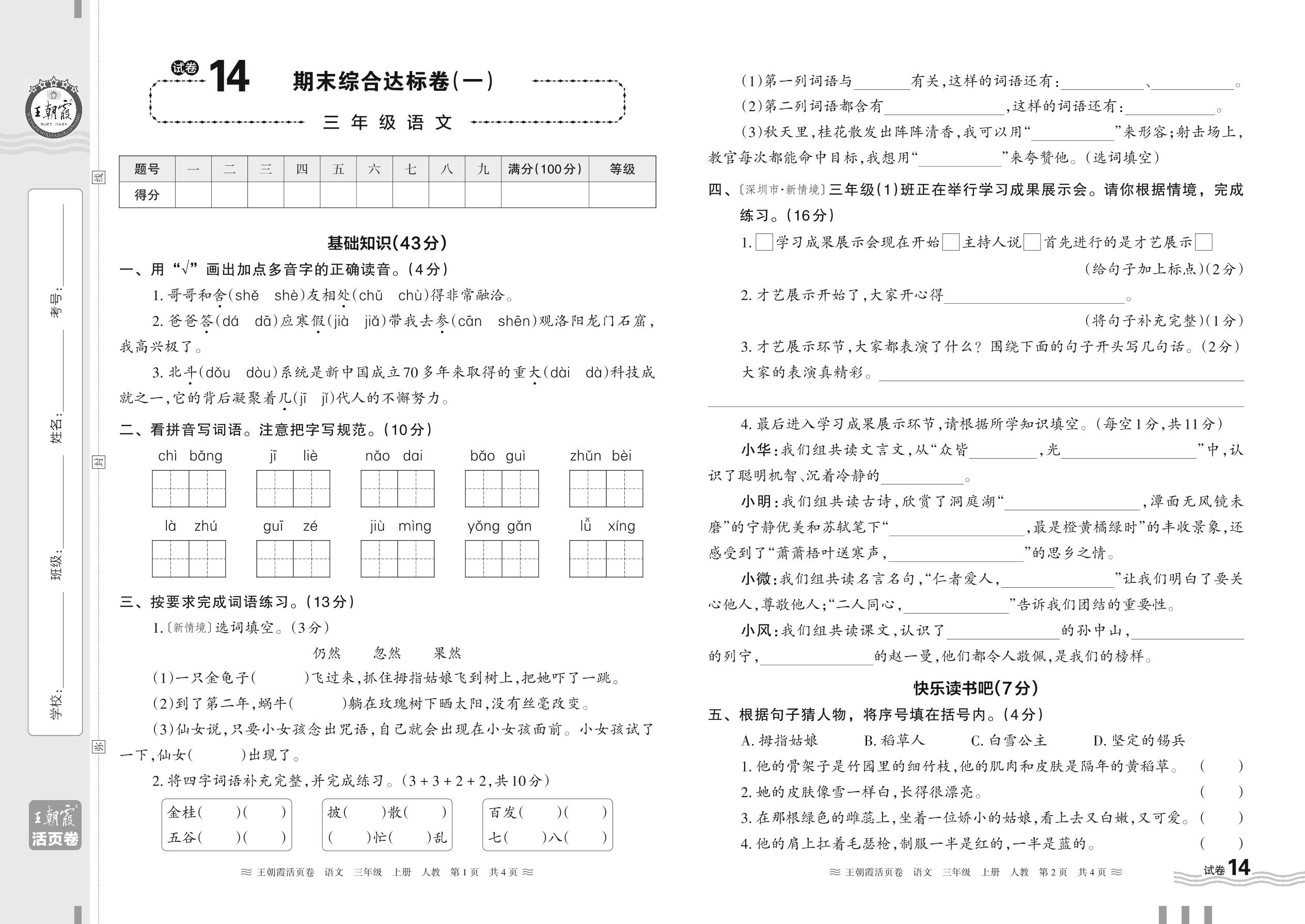 2023上册三年级语文人教版 试卷14 期末综合达标卷(一)