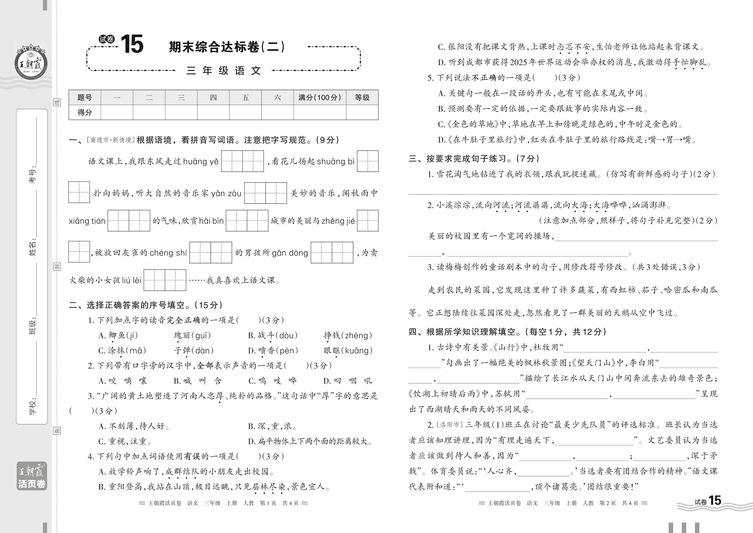 2023上册三年级语文人教版 试卷15 期末综合达标卷(二)