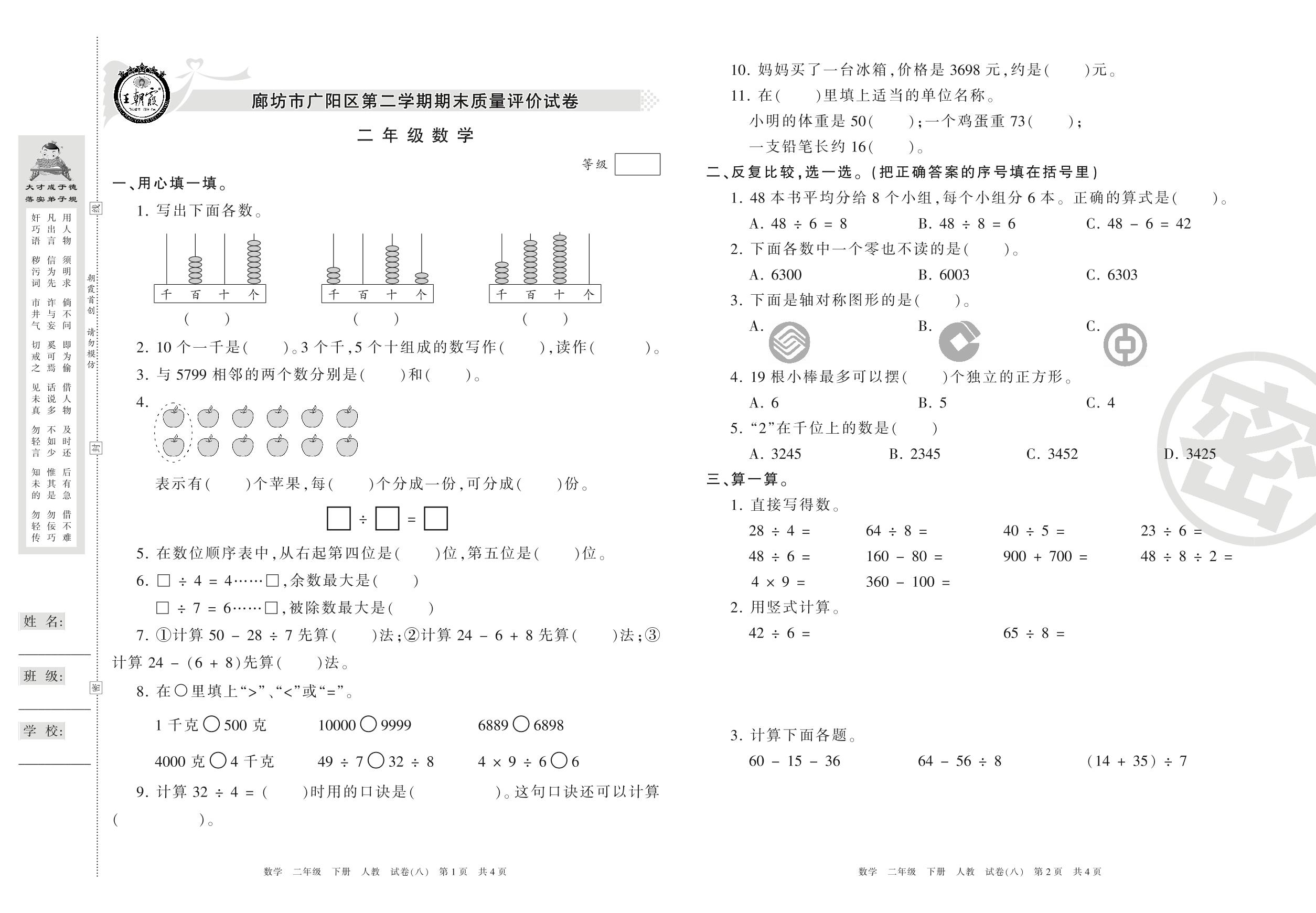 2015-2016学年第二学期廊坊市广阳区二年级数学试卷(人教版)【8】