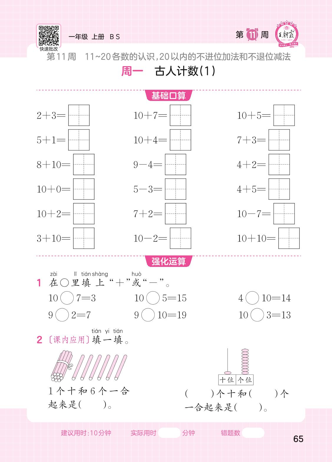 2023上册一年级数学北师版 第11周口算运算