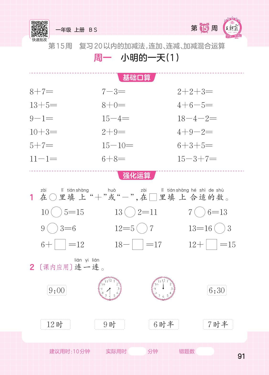 2023上册一年级数学北师版 第15周口算运算