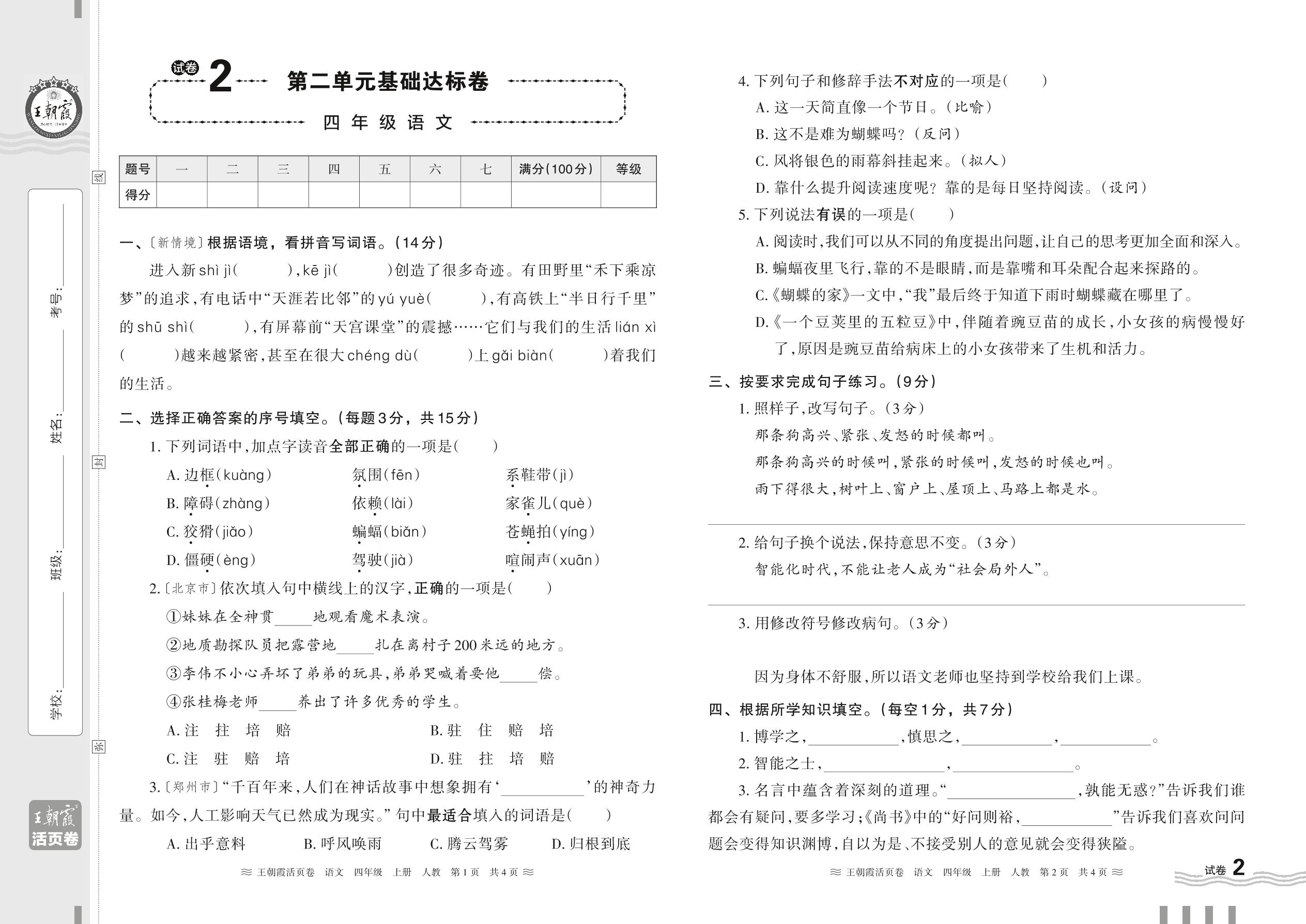 2023上册四年级语文人教版 试卷2 第二单元基础达标卷