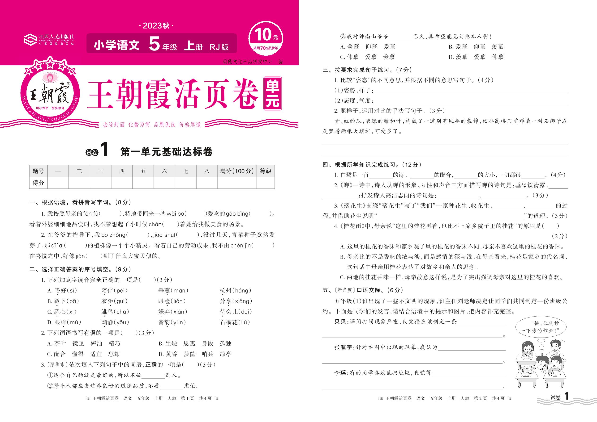 2023上册五年级语文人教版 试卷1 第一单元基础达标卷