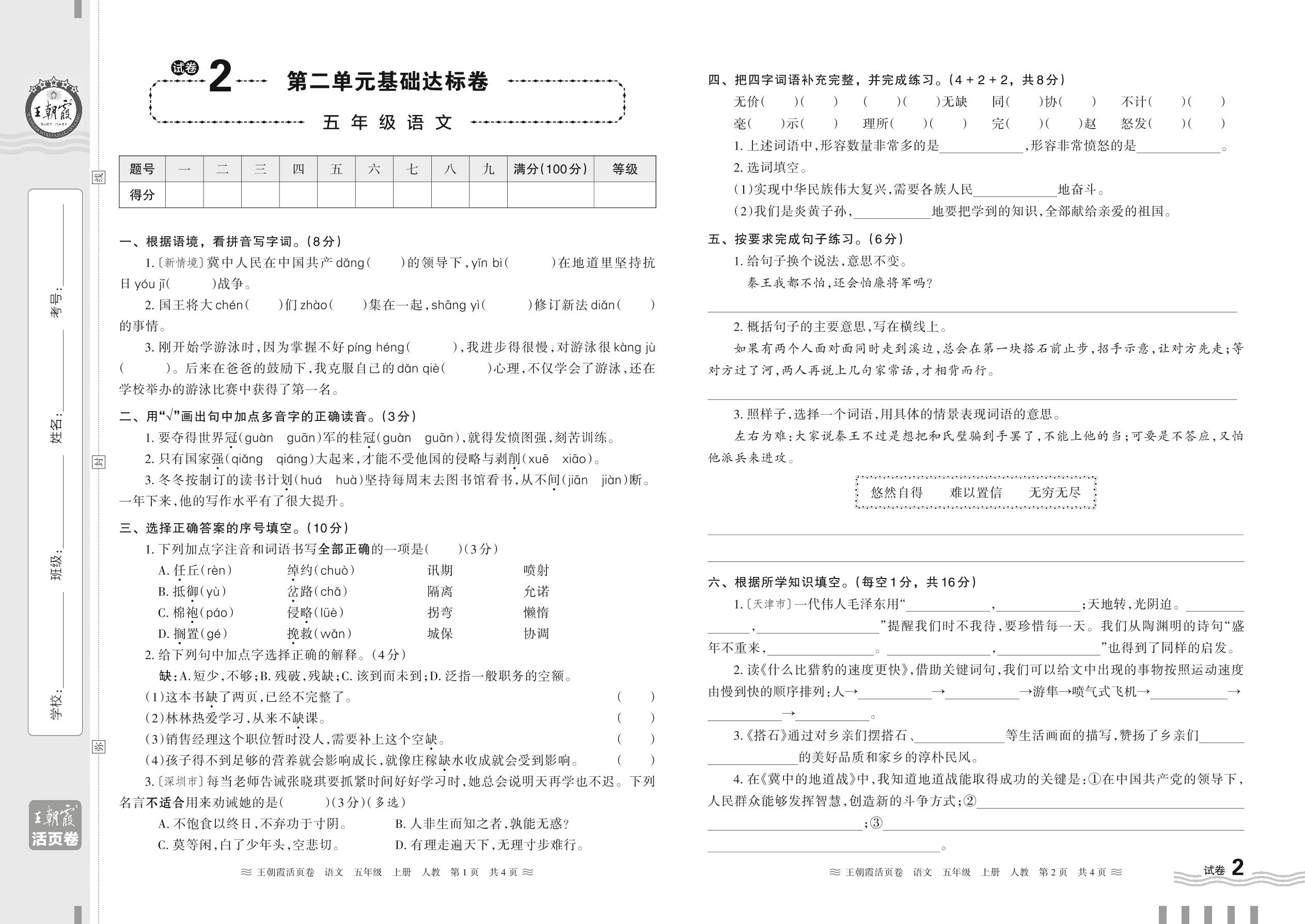 2023上册五年级语文人教版 试卷2 第二单元基础达标卷