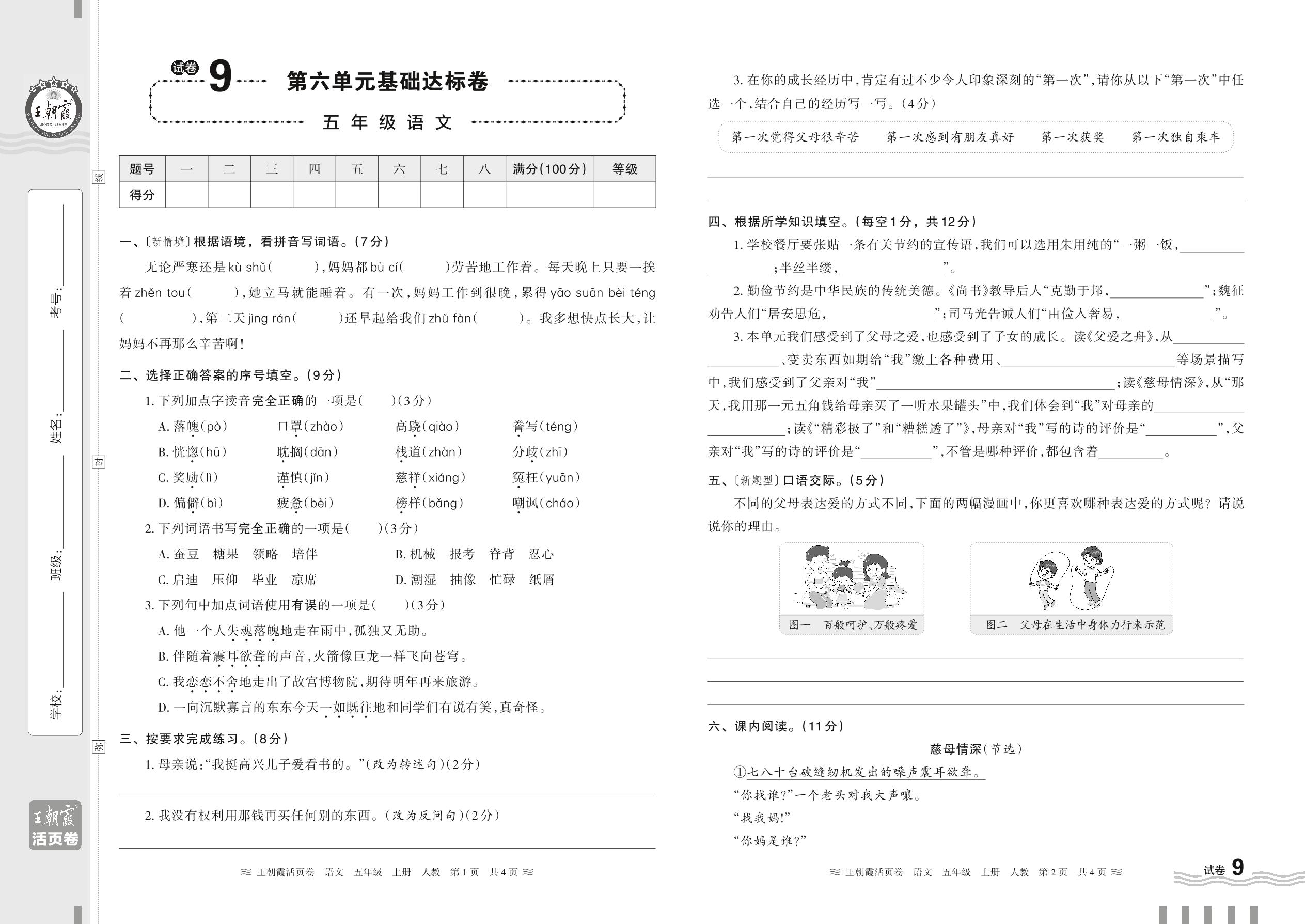 2023上册五年级语文人教版 试卷9 第六单元基础达标卷