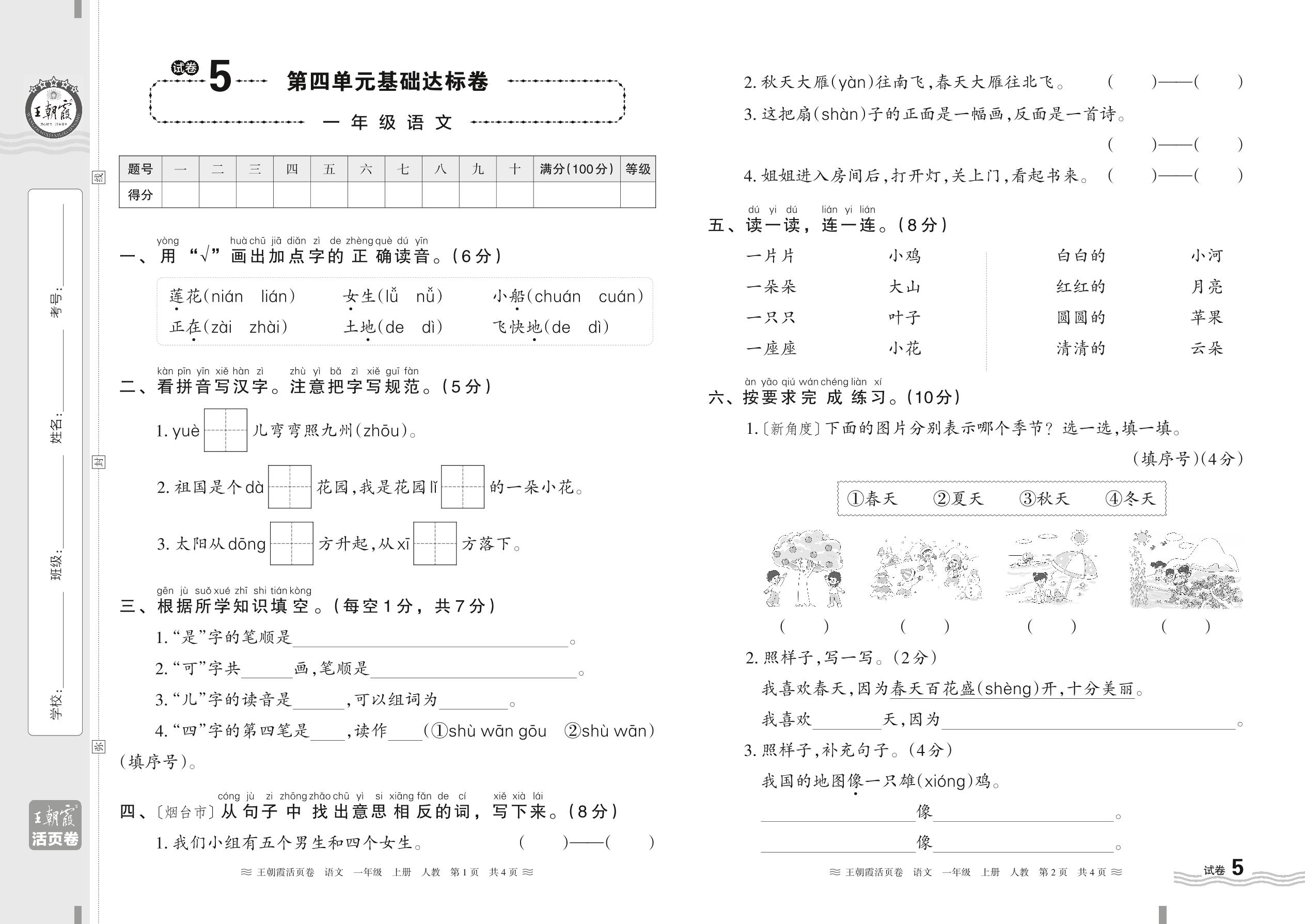 2023上册一年级语文人教版 试卷5 第四单元基础达标卷