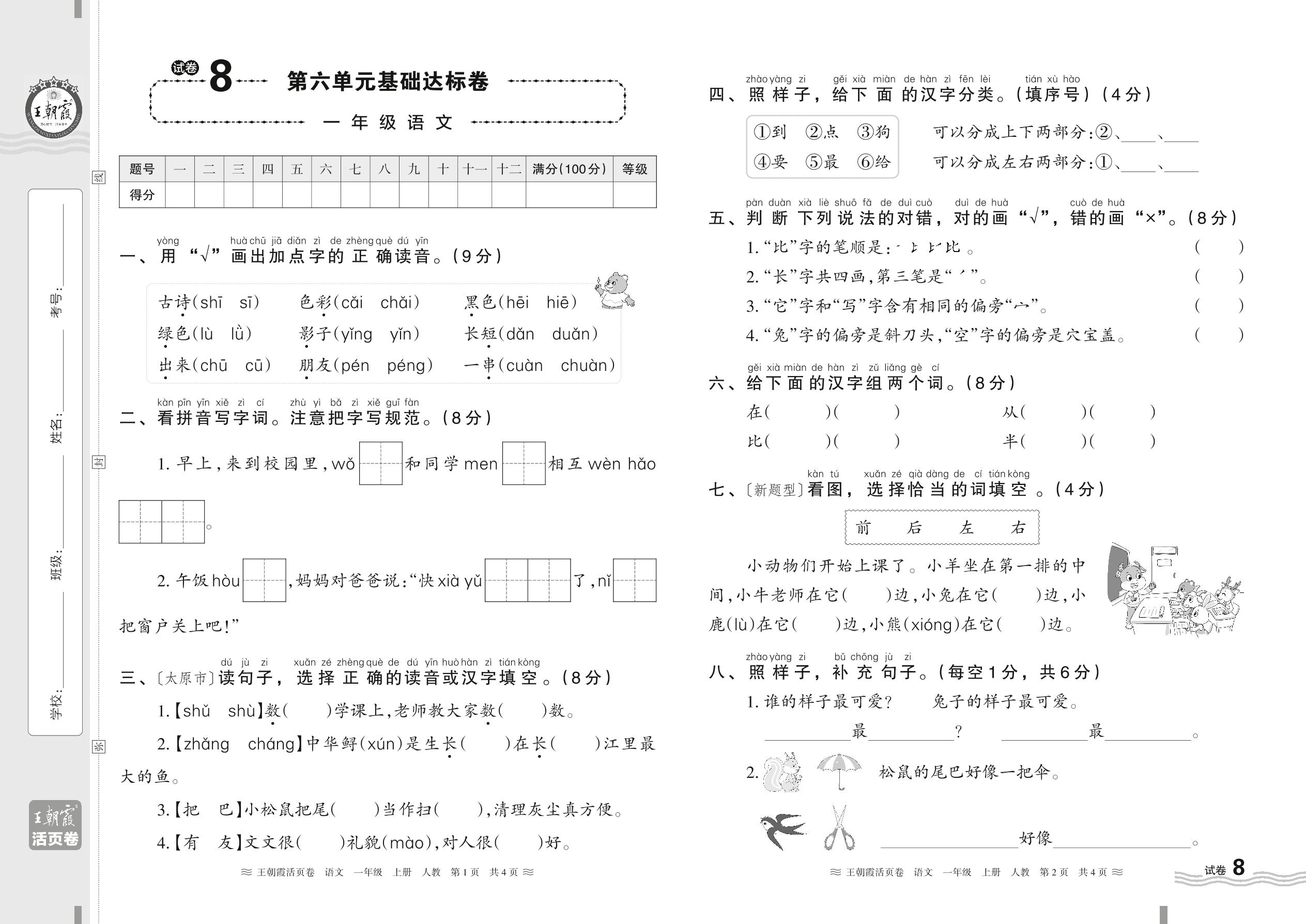 2023上册一年级语文人教版 试卷8 第六单元基础达标卷