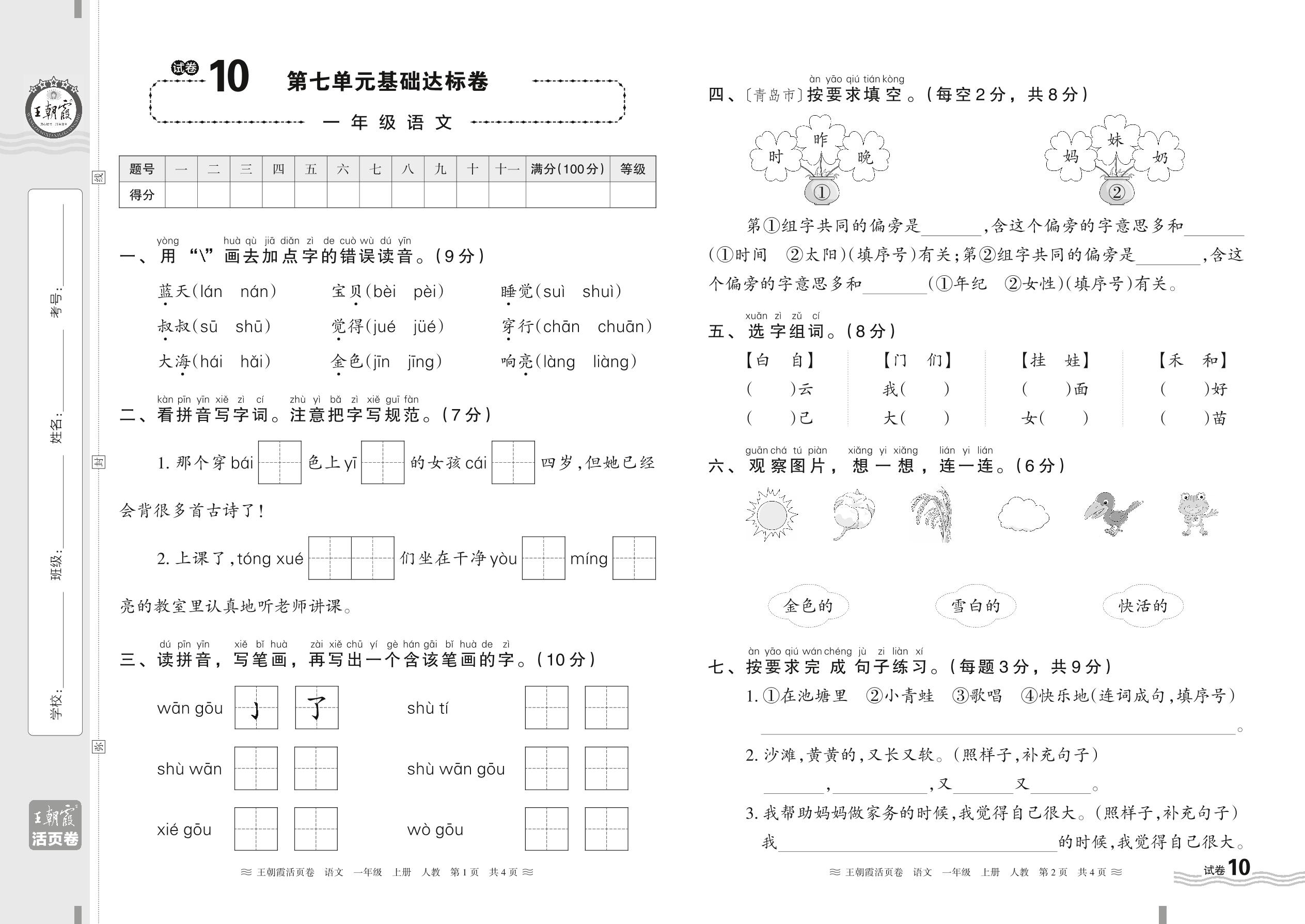 2023上册一年级语文人教版 试卷10 第七单元基础达标卷