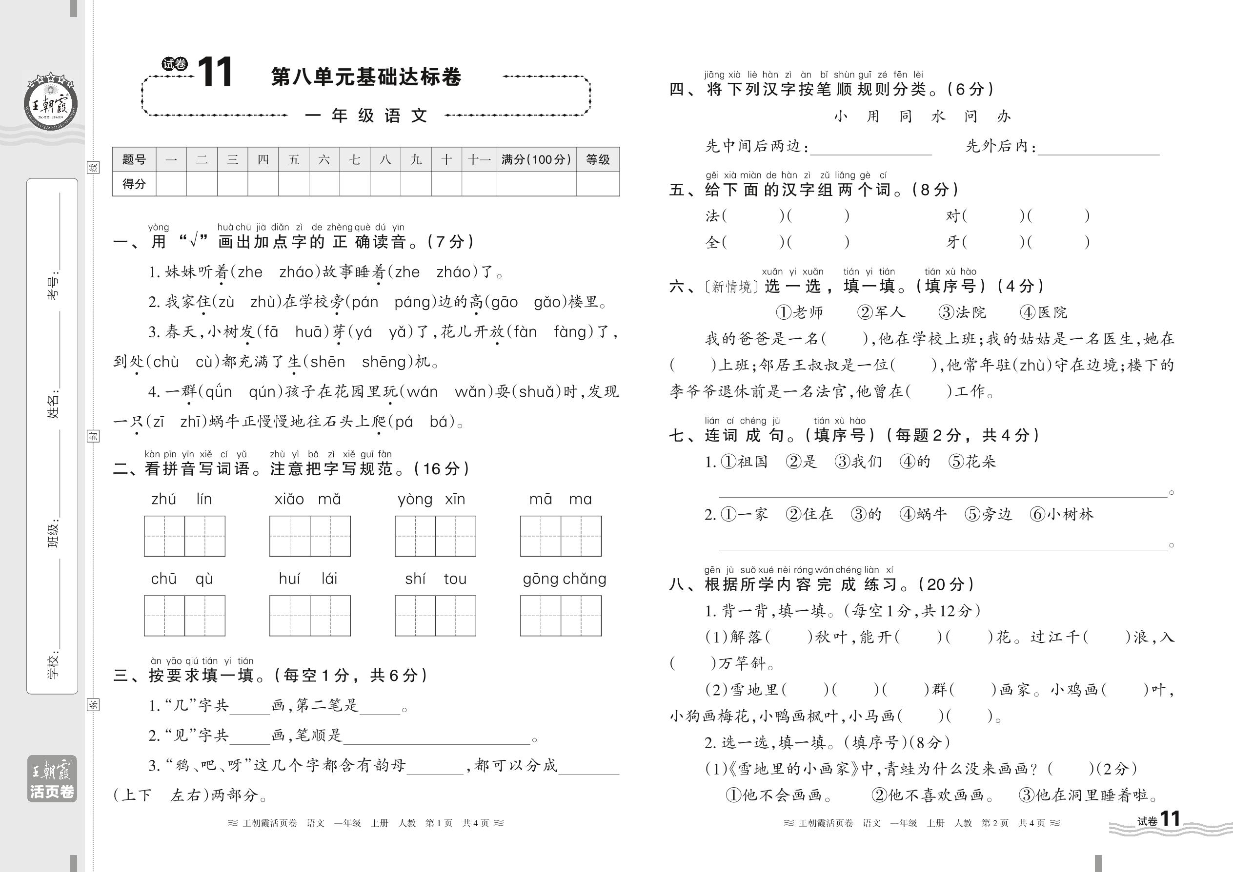 2023上册一年级语文人教版 试卷11 第八单元基础达标卷