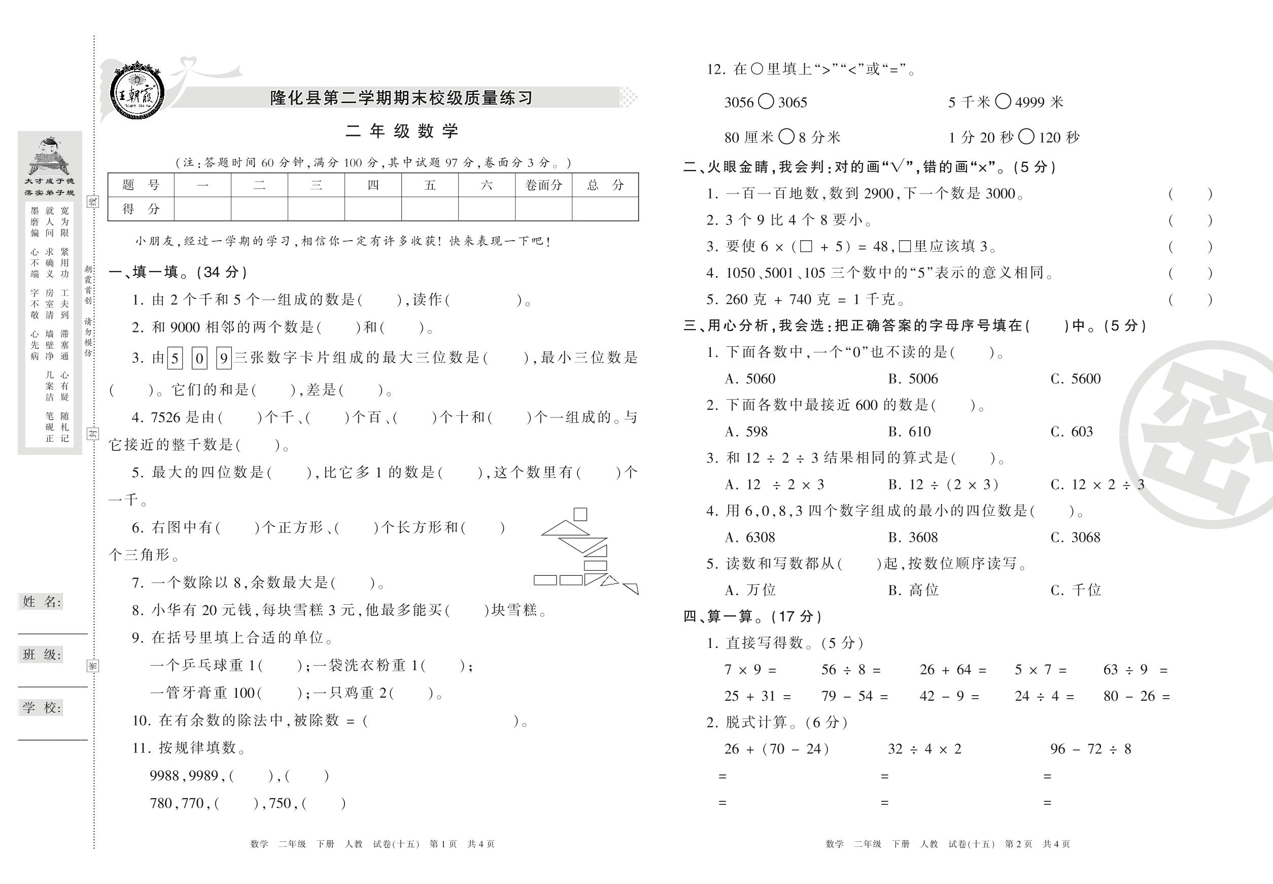 2015-2016学年第二学期承德市隆化县二年级数学试卷(人教版)【15】