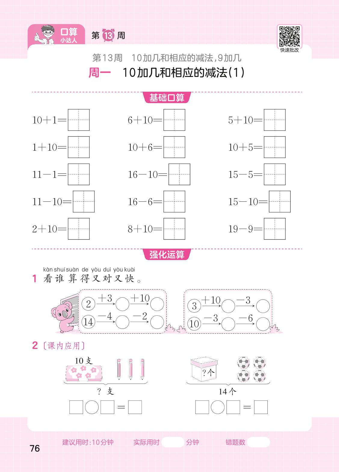 2023上册一年级数学苏教版 第13周口算运算