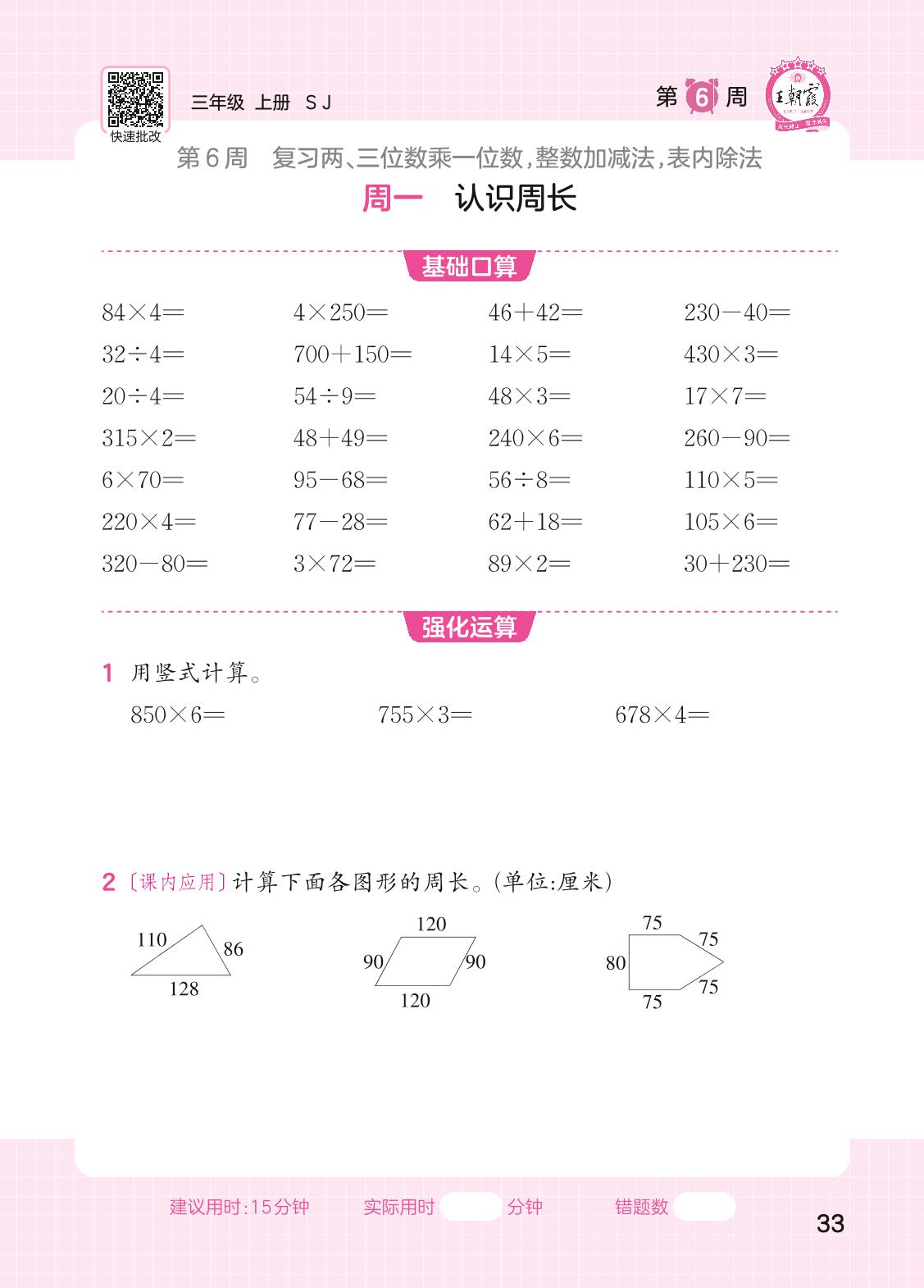2023上册三年级数学苏教版 第6周口算运算