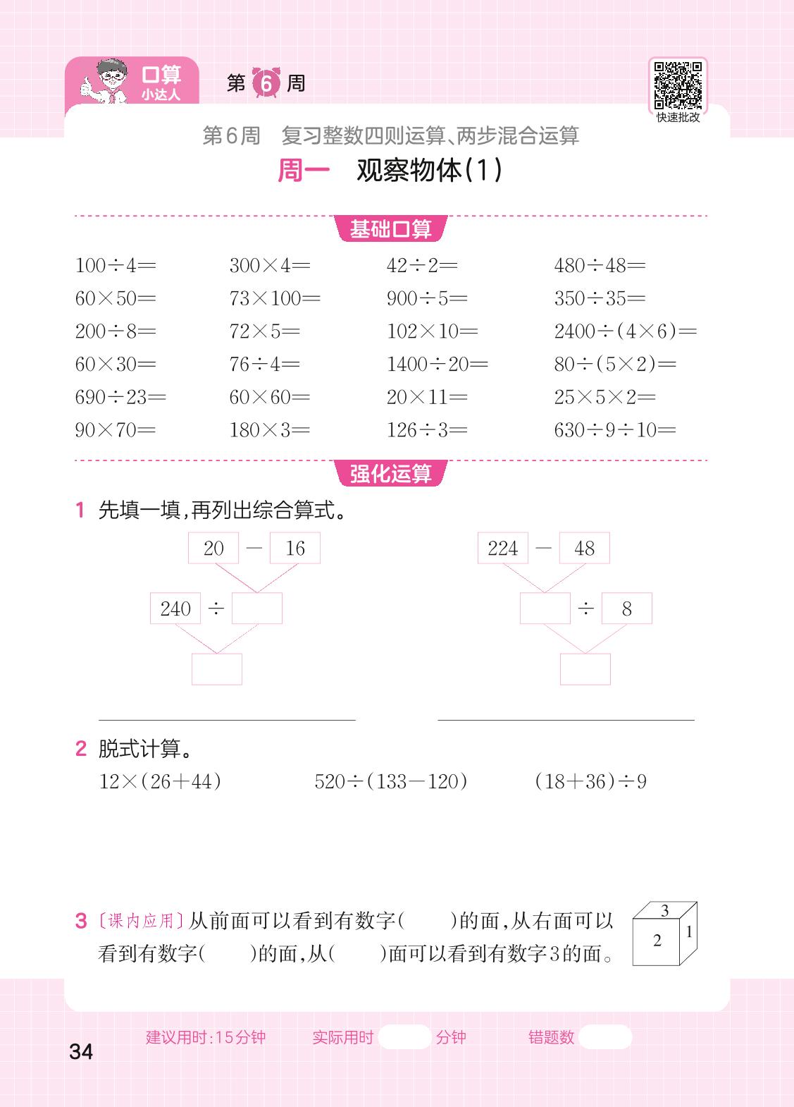 2023上册四年级数学苏教版 第6周口算运算