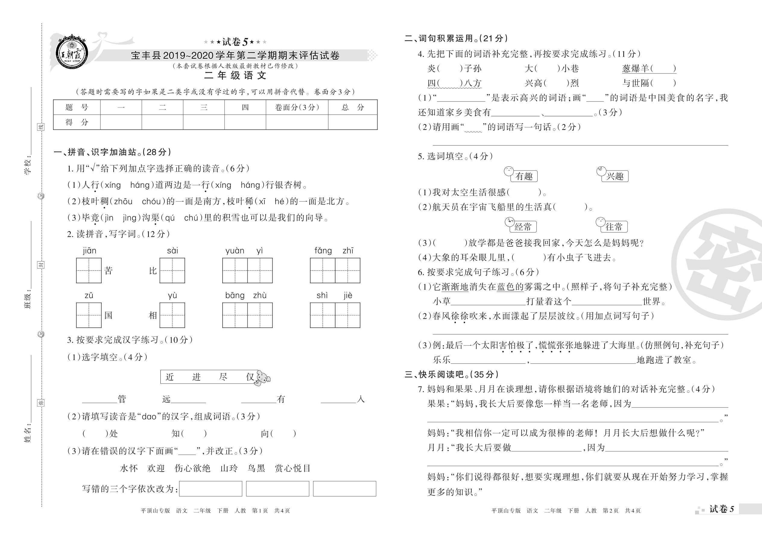 2019-2020学年第二学期平顶山市宝丰县二年级语文试卷(人教版)【5】