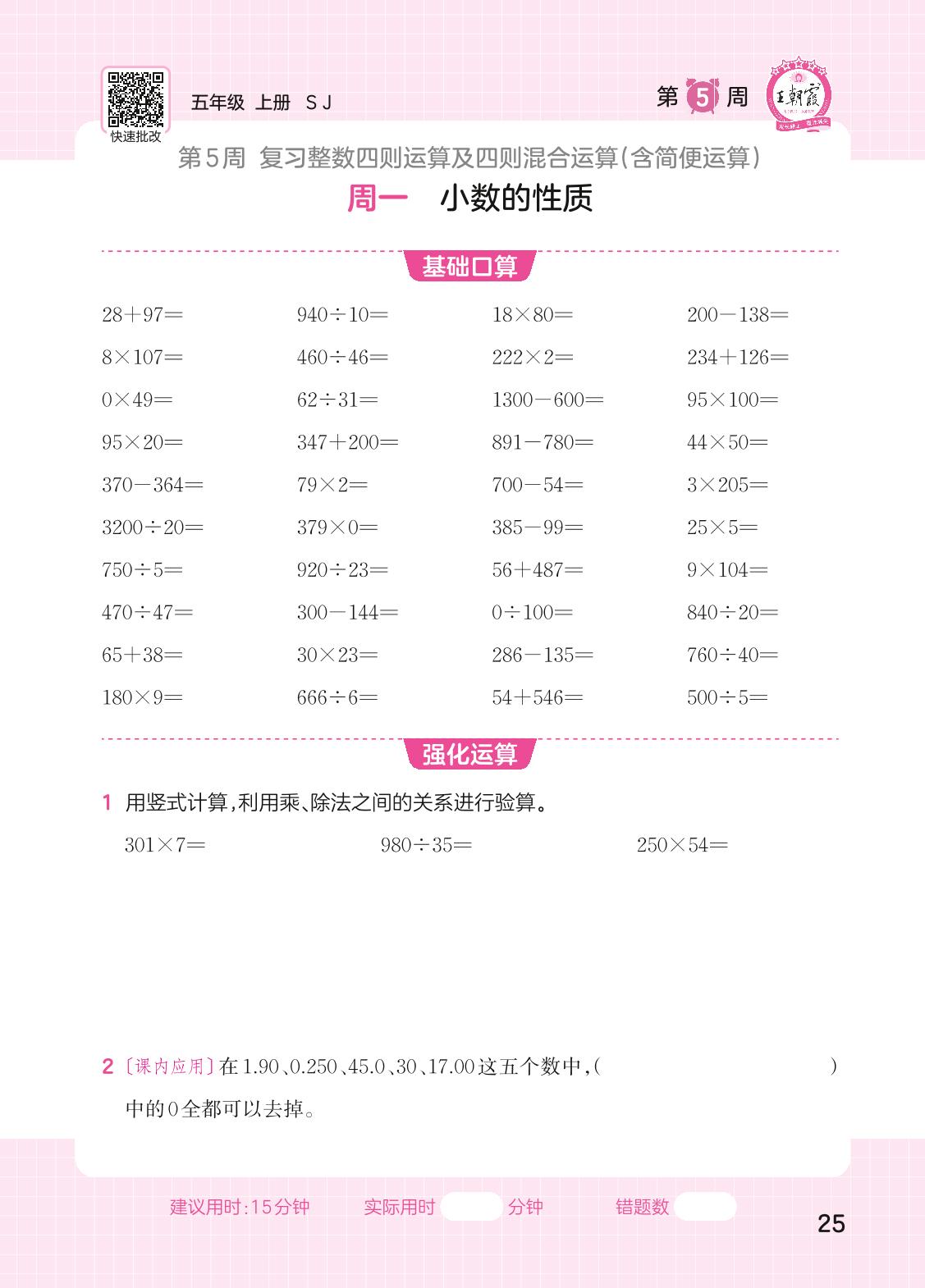 2023上册五年级数学苏教版 第5周口算运算