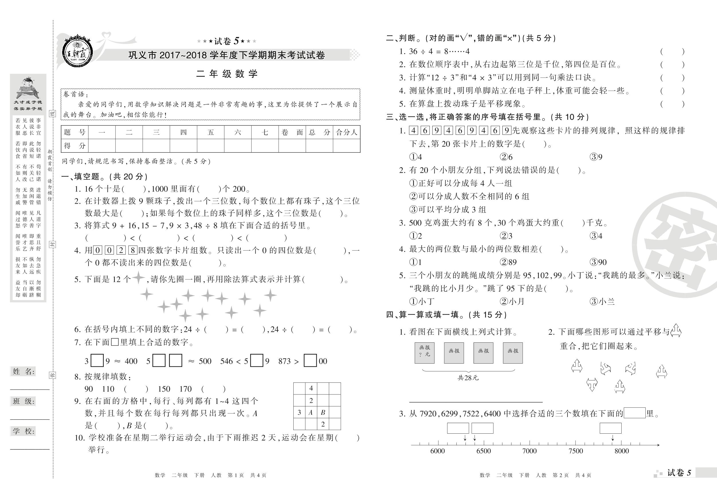2017-2018学年第二学期巩义市二年级数学试卷(人教版)【5】