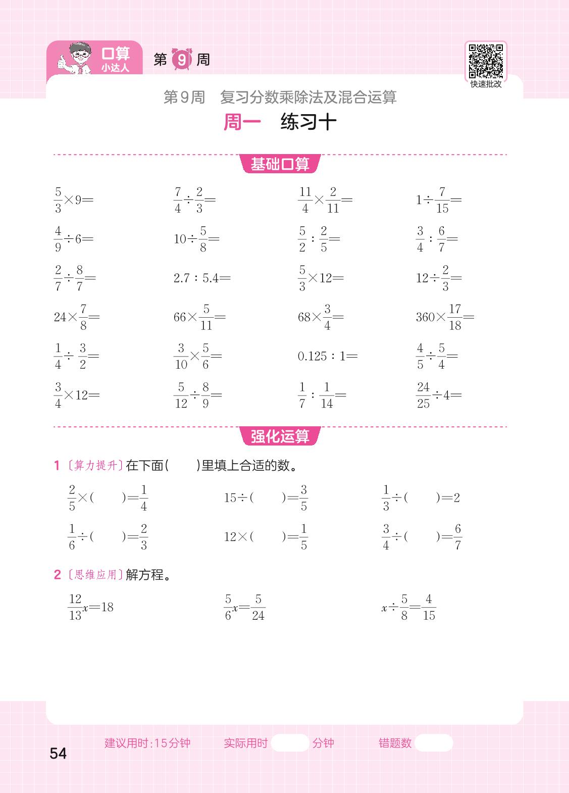 2023上册六年级数学苏教版 第9周口算运算