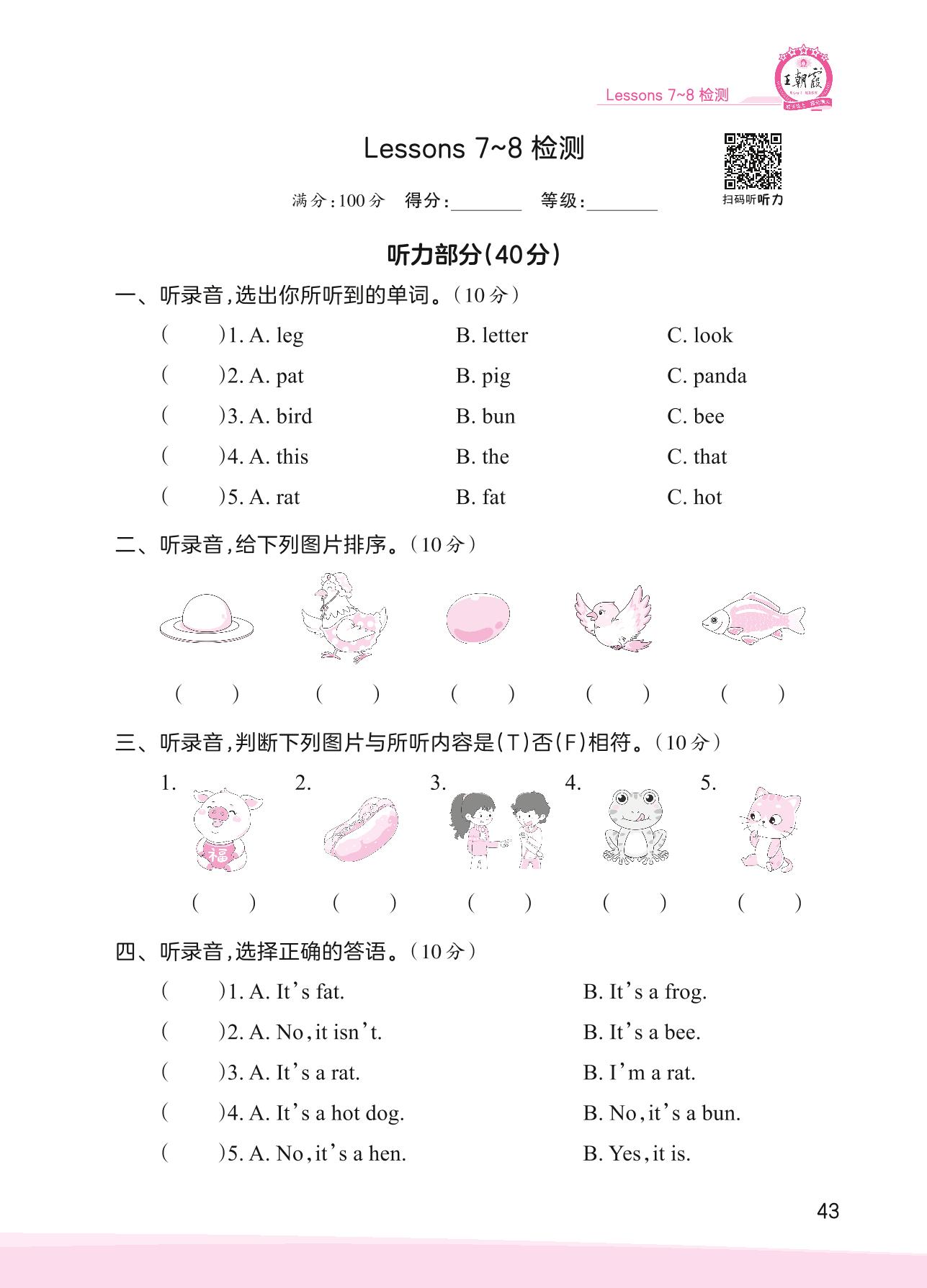 2023上册三年级英语科普版 Lessons 7~8 检测