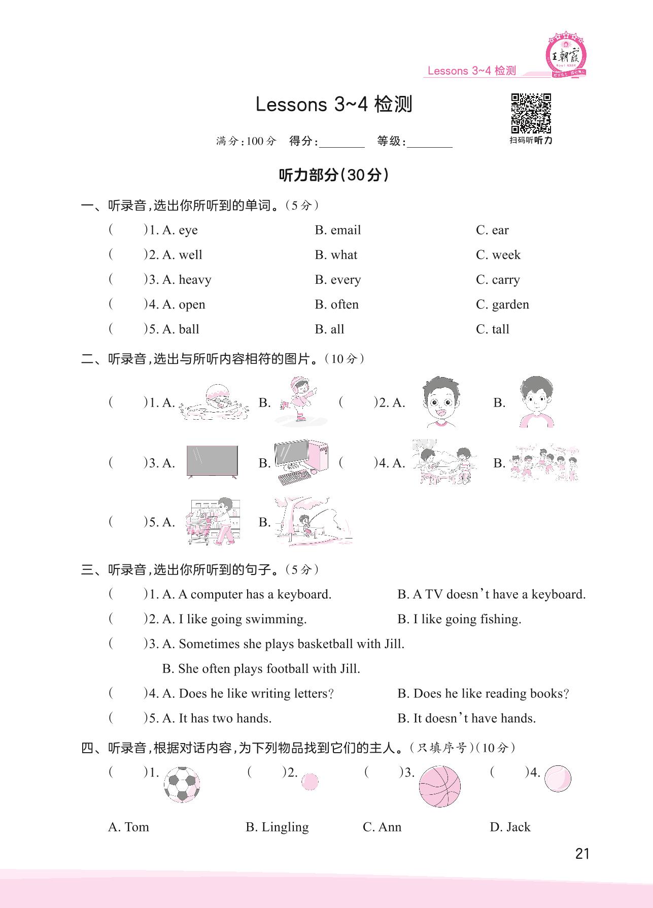 2023上册五年级英语科普版 Lessons 3~4 检测