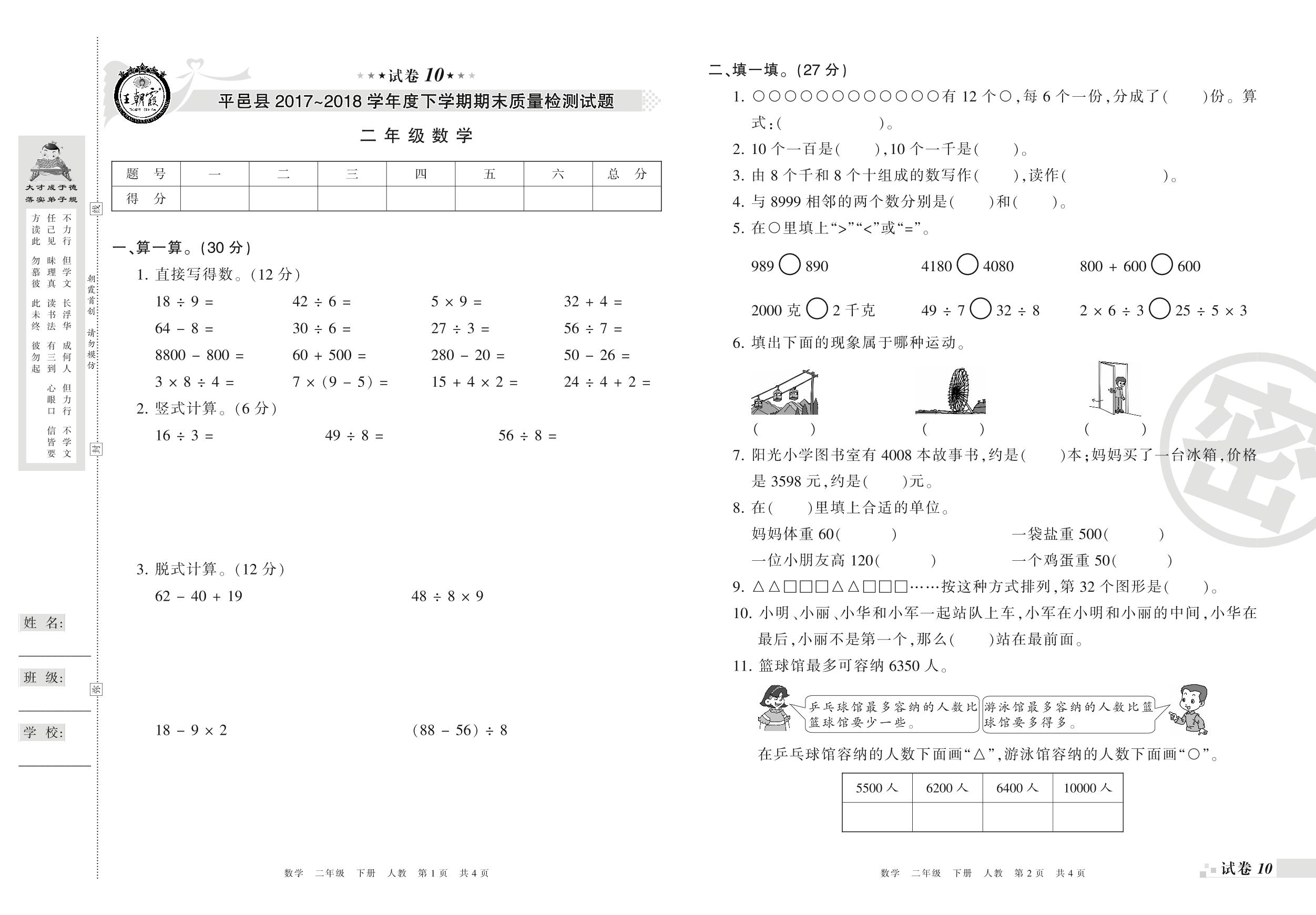 2017-2018学年第二学期临沂市平邑县二年级数学试卷(人教版)【10】