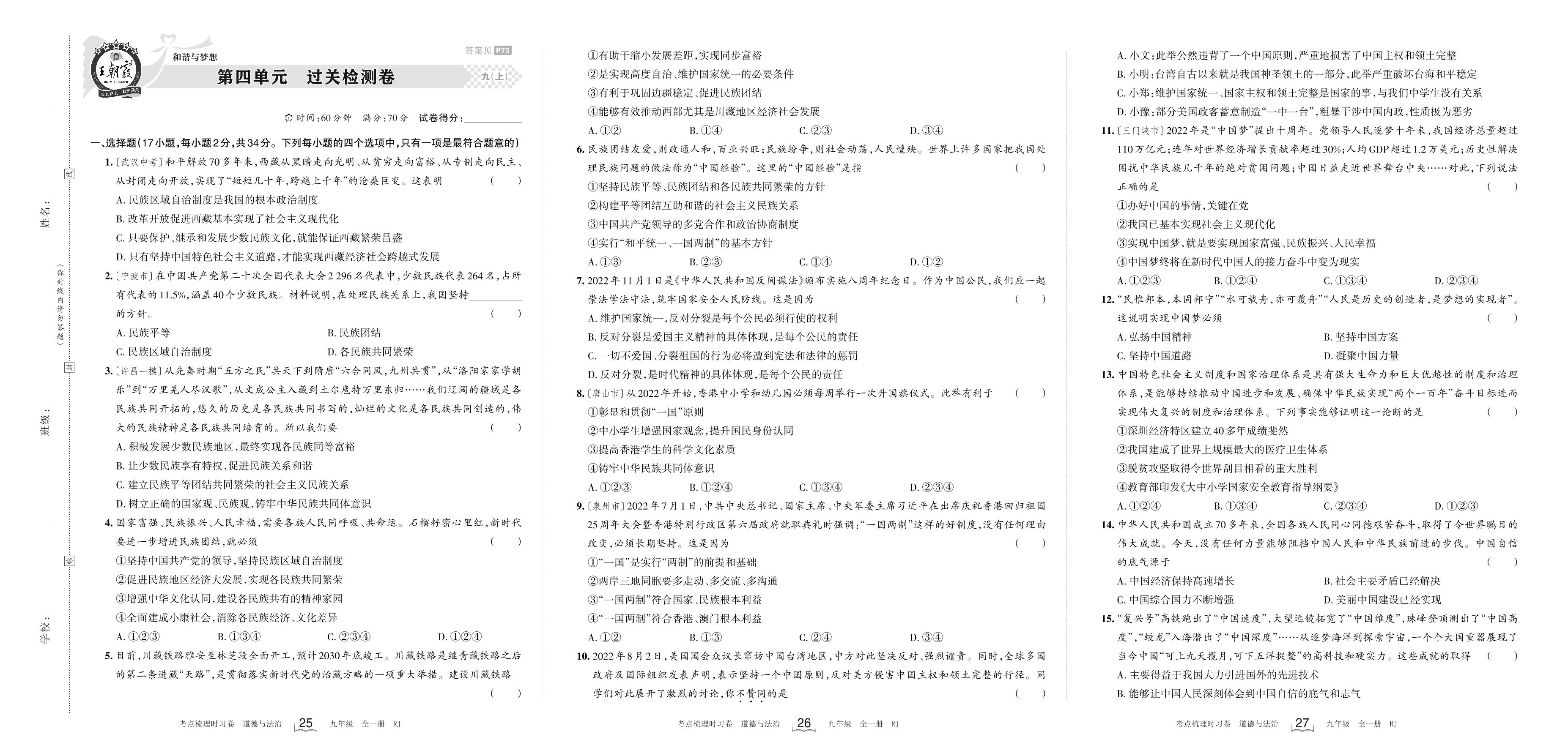 2023上册九年级道德与法治人教版 第四单元 过关检测卷(8月版)