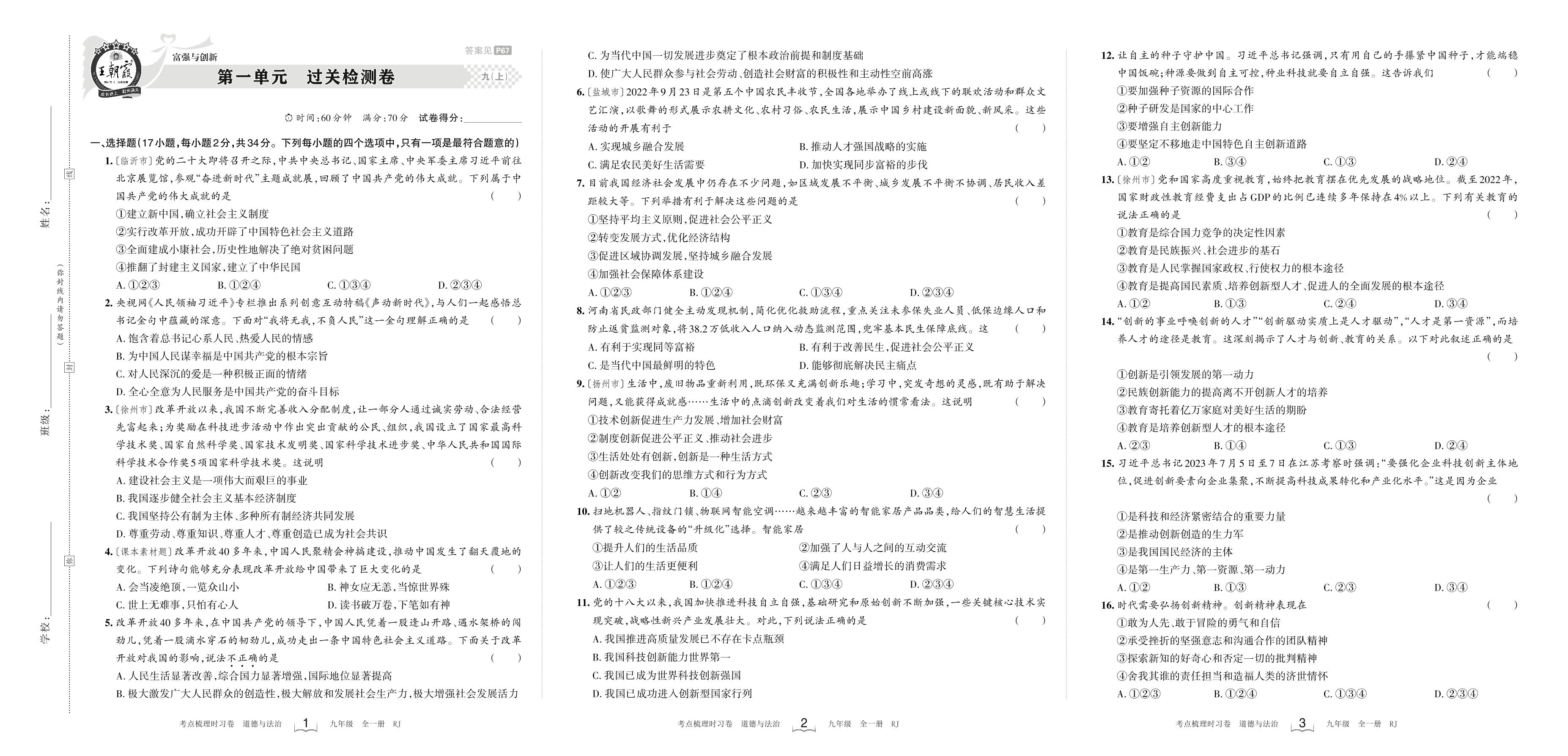 九年级道德与法治人教版上册单元卷