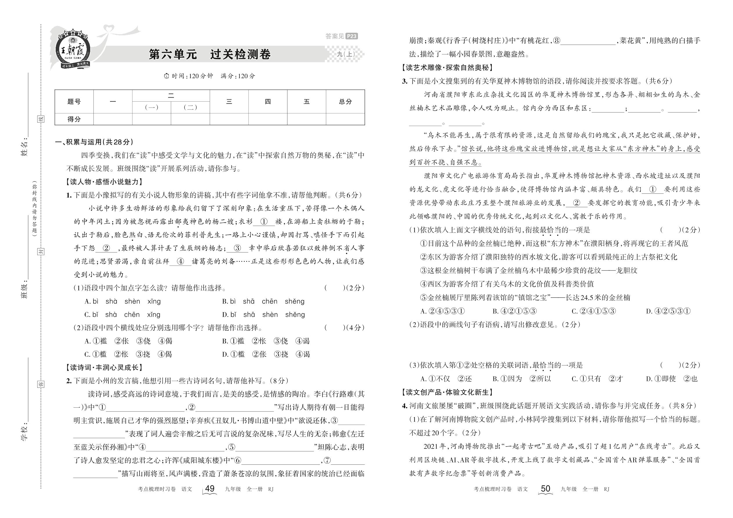 2023上册九年级语文人教版 第六单元 过关检测卷(8月版)
