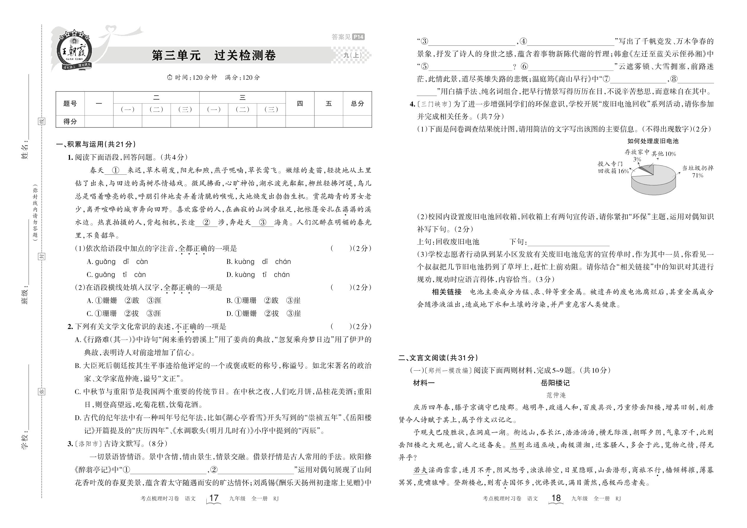 2023上册九年级语文人教版 第三单元 过关检测卷(8月版)