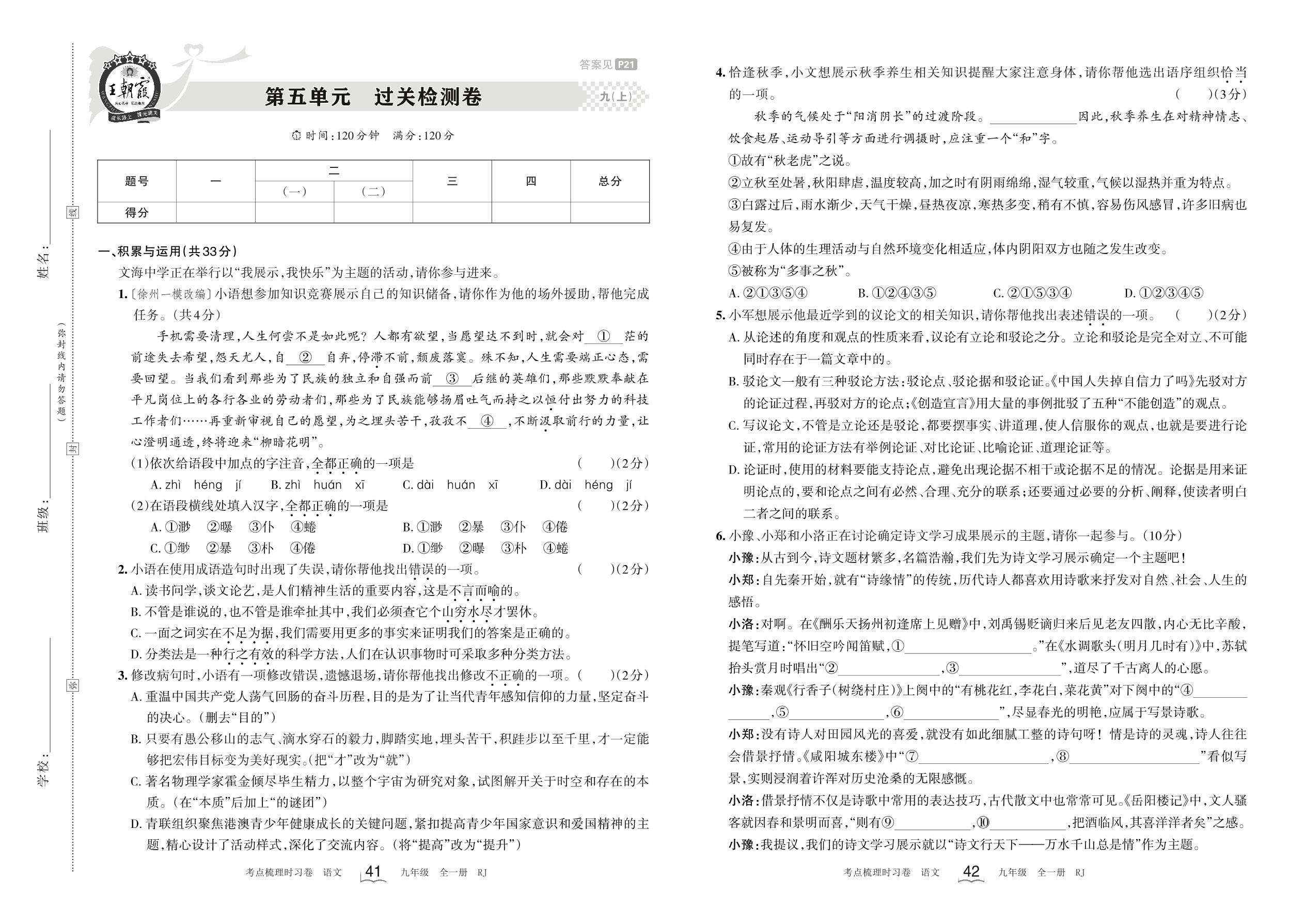 2023上册九年级语文人教版 第五单元 过关检测卷(8月版)