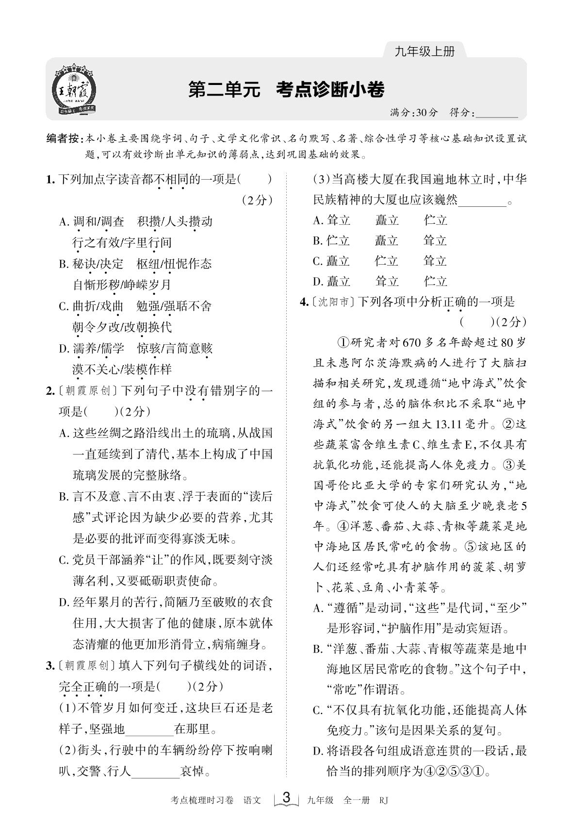 2023上册九年级语文人教版 第二单元 考点诊断小卷(8月版)