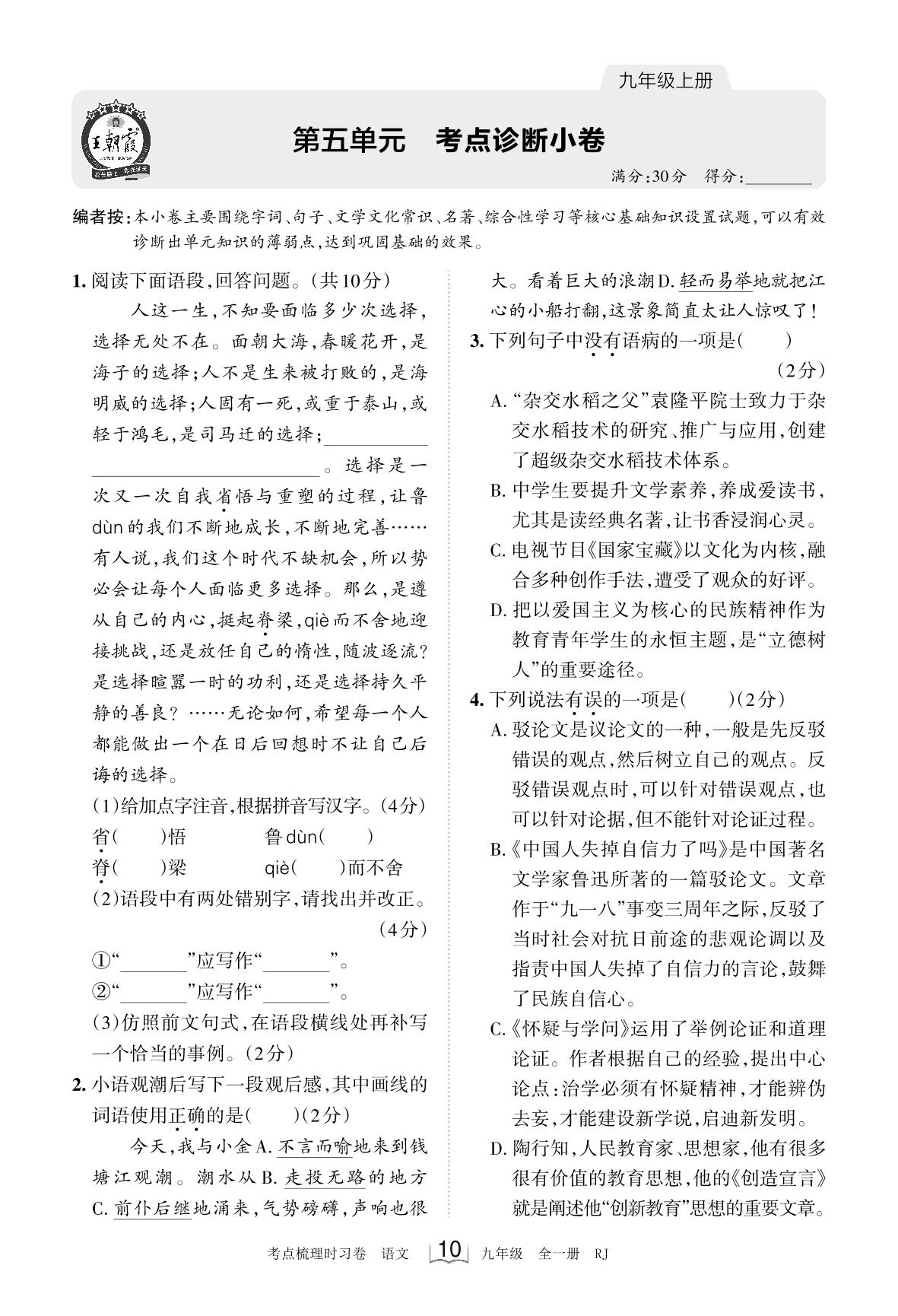 2023上册九年级语文人教版 第五单元 考点诊断小卷(8月版)