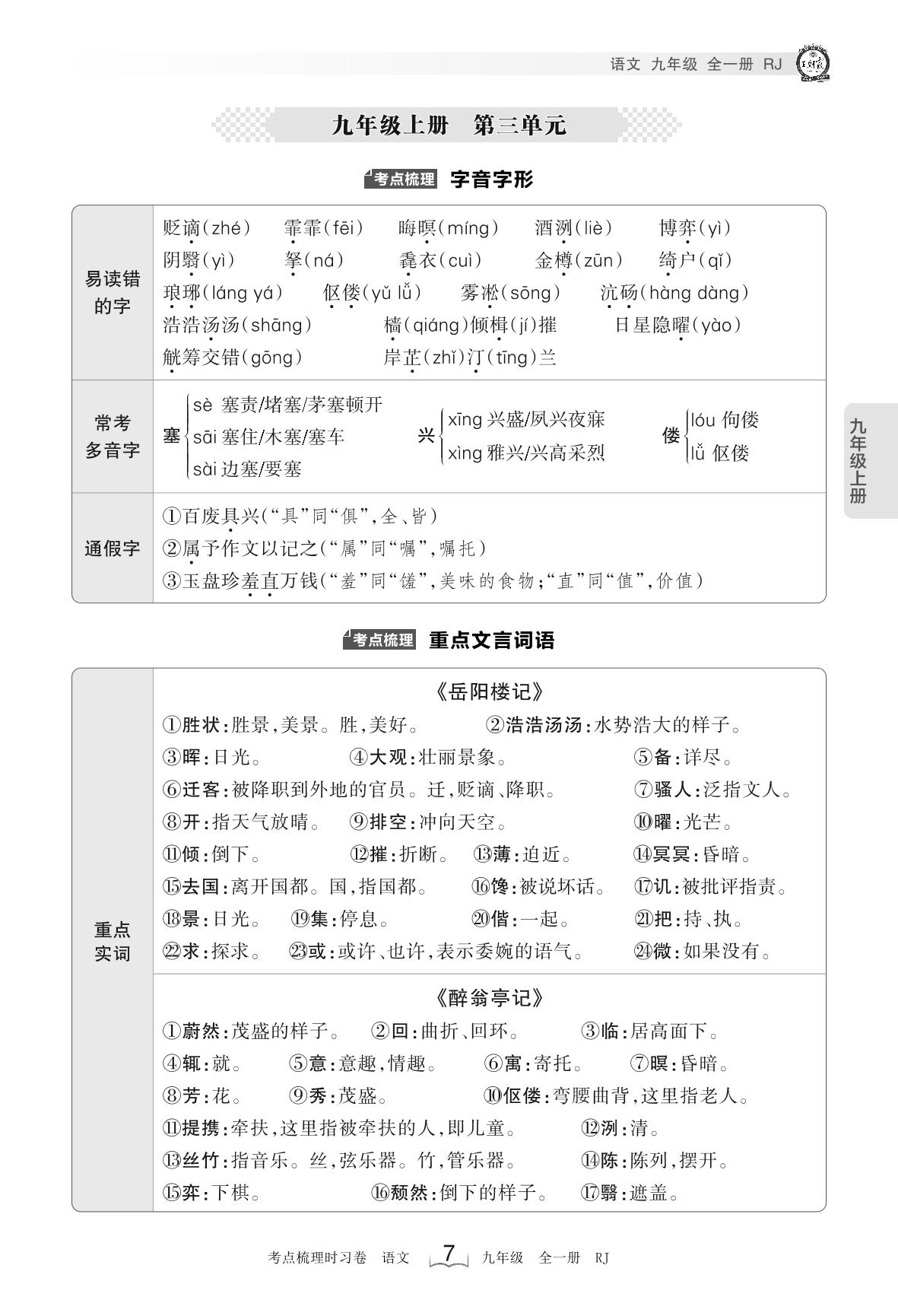 2023上册九年级语文人教版 考点梳理手册——九年级上册 第三单元(8月版)