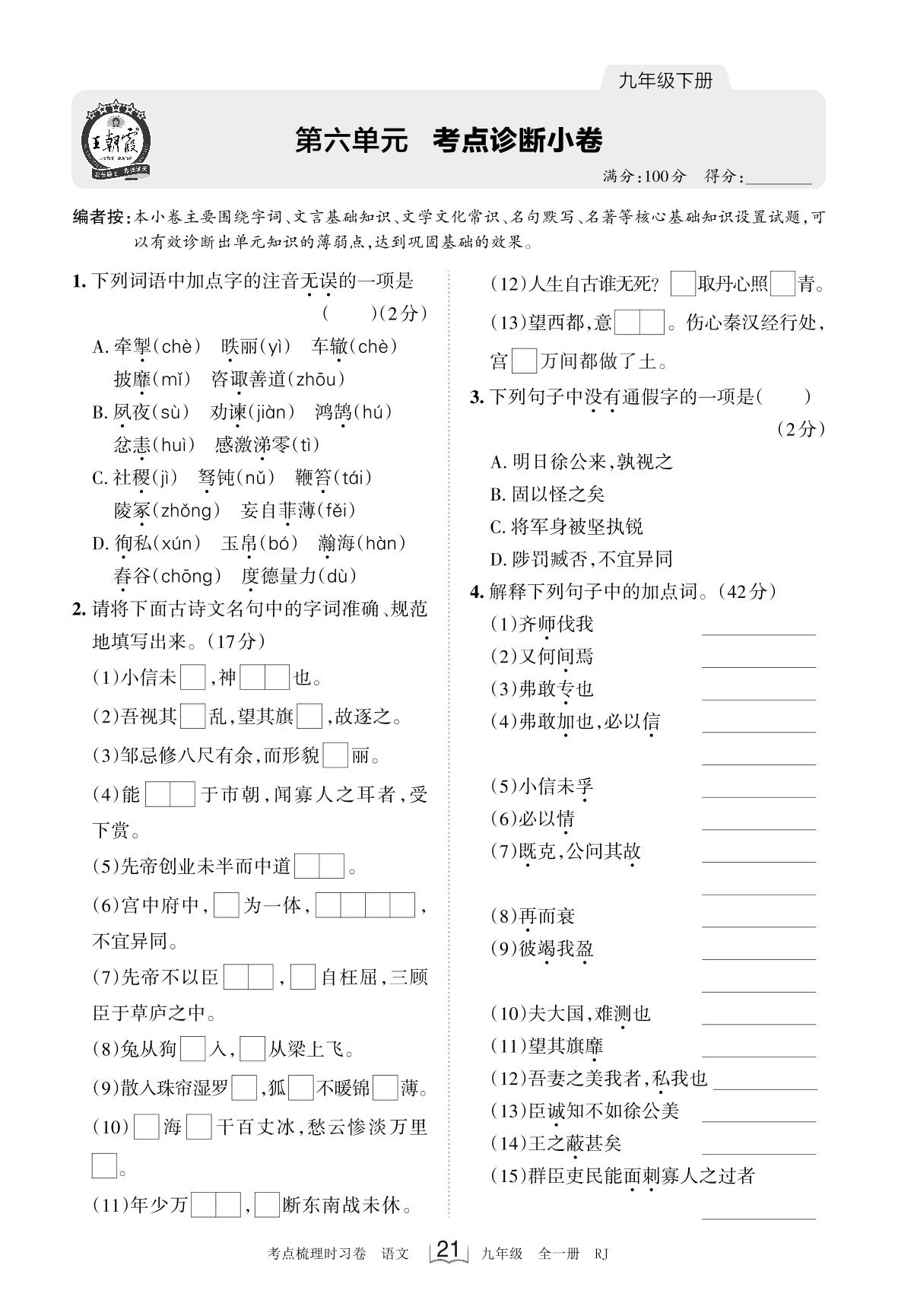 2024下册九年级语文人教版 第六单元 考点诊断小卷(8月版)