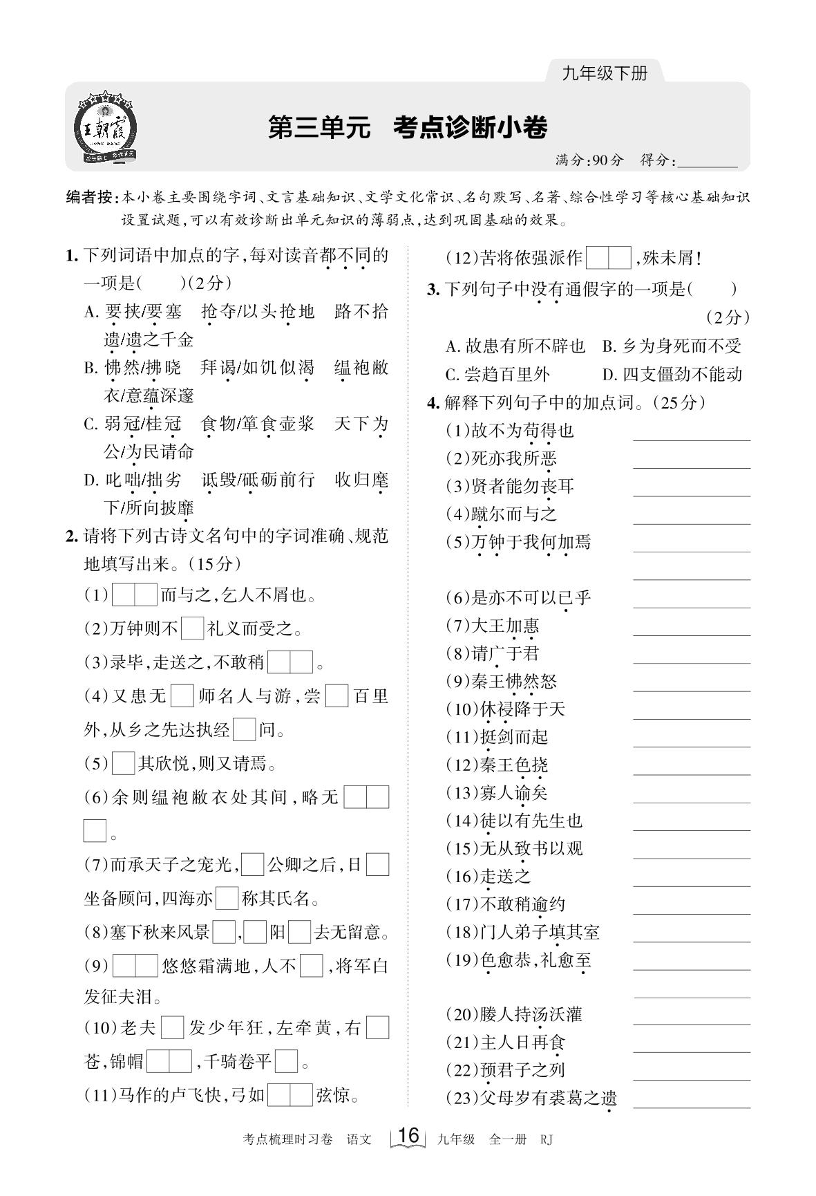 2024下册九年级语文人教版 第三单元 考点诊断小卷(8月版)