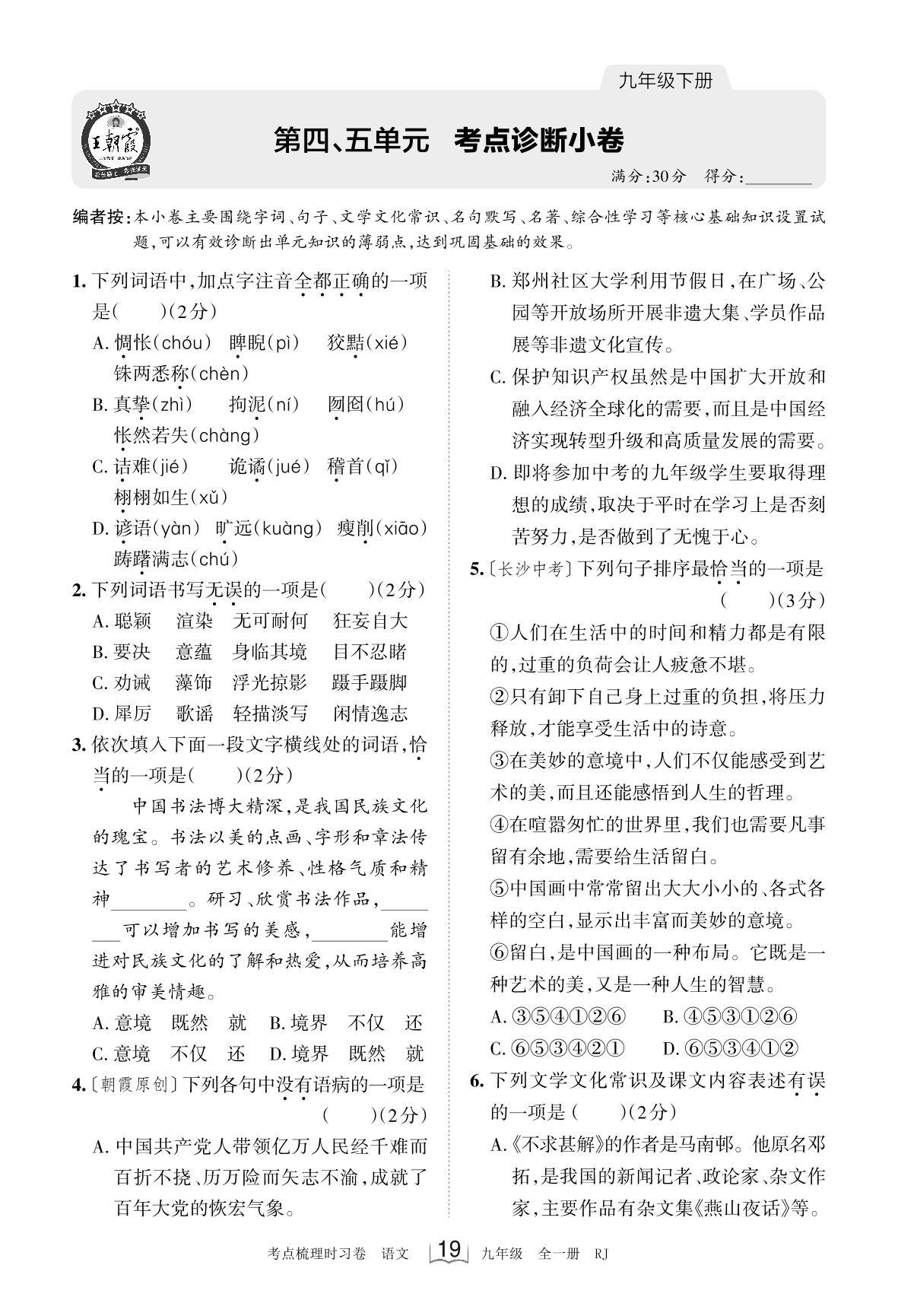 2024下册九年级语文人教版 第四、五单元 考点诊断小卷(8月版)