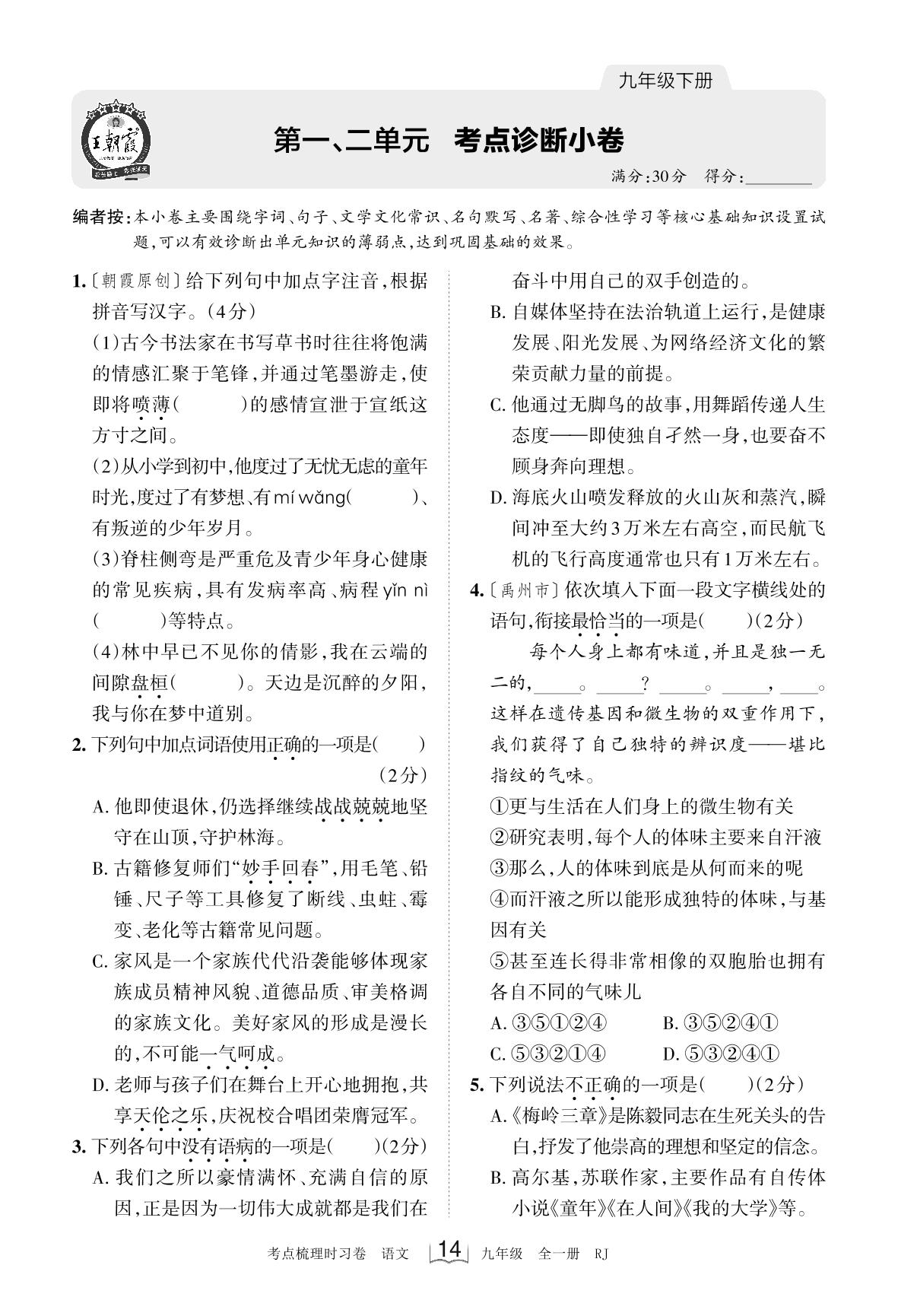 2024下册九年级语文人教版 第一、二单元 考点诊断小卷(8月版)